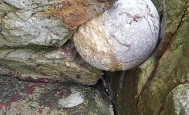 Đó là một tảng đá hình cầu, đường kính khoảng trên 40cm, nằm sâu trong hốc đá. Bề mặt nhẵn mịn, phần ánh màu pha lê, phần vân vũ nền trời sắp đổ cơn mưa, nom như viên ngọc quý trong miệng rồng. Rất tiếc, khi chúng tôi đến, nước triều đã rút ra xa, không được ngắm tảng đá trăm cân dập dờn trong nước, quay tròn theo nhịp sóng vỗ bờ. Nhưng lại bao quát được cảnh quan nơi đây, những khối đá ngàn cân xếp chồng lên nhau, tạo thế nghinh phong, thủ sóng. Những lớp sóng ngoài khơi đổ về, gặp đá thành, tung lên như hoa biển.