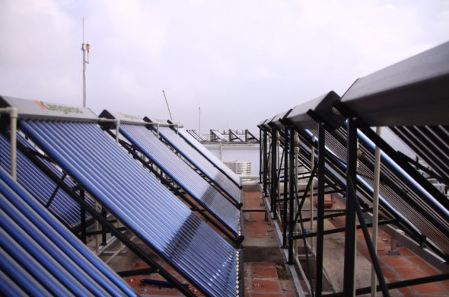 Hệ thống thu nhiệt năng từ mặt trời để làm nóng nước đặt tại tầng thượng mỗi tòa