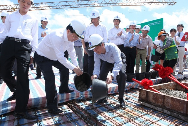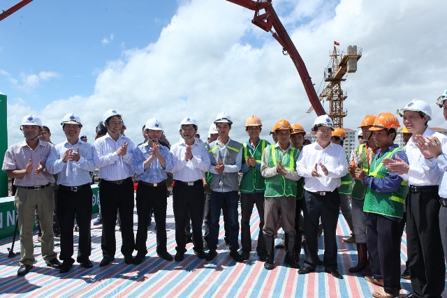 Bộ trưởng Bộ Xây dựng Trịnh Đình Dũng, Thứ trưởng Bộ Xây dựng Nguyễn Trần Nam cùng lãnh đạo Tổng công ty Viglacera – CTCP đổ bê tông cất nóc Khu NƠXH giai đoạn 3 Đặng Xá