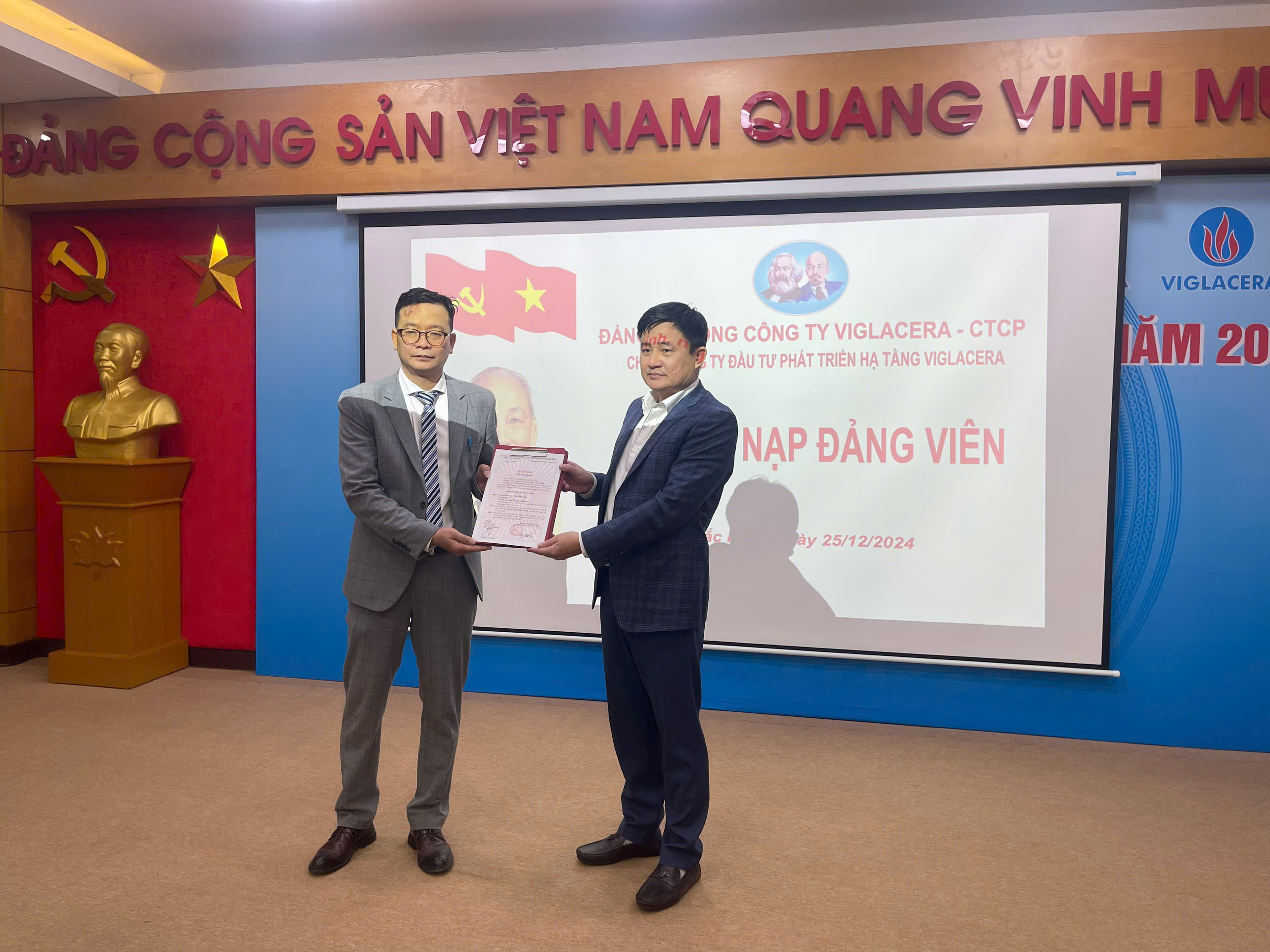 Ngày 25/12/2024, Đảng ủy Tổng công ty Viglacera – CTCP và Chi bộ Công ty Đẩu tư phát triển Hạ tầng Viglacera tổ chức Lễ kết nạp Đảng cho đồng chí Châu Trần Tuyên – Nhân viên Xí nghiệp QLVH Khu chung cư 671 Hoàng Hoa Thám.