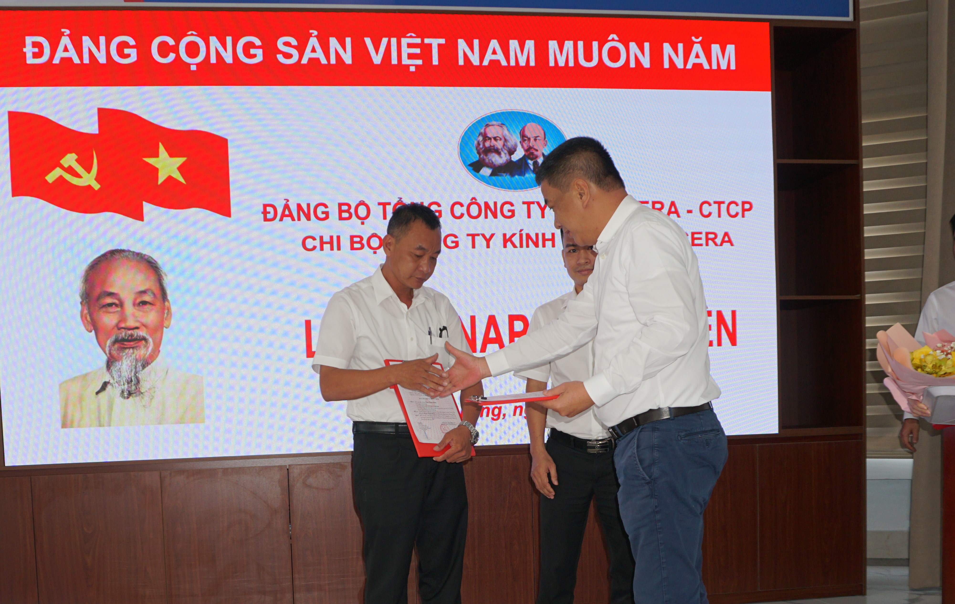 Cũng tại buổi lễ, đ/c Nguyễn Minh Khoa - Ủy viên BCH Đảng ủy Tổng công ty Viglacera- CTCP và các đồng chí trong Ban Chi ủy Chi bộ trao quyết định kết nạp và chúc mừng 2 đồng chí Đảng viên mới. Đồng thời đ/c Bí thư Chi bộ Công ty Kính nổi Viglacera phát biểu giao nhiệm vụ cho các đồng chí đảng viên mới kết nạp. Tin tưởng các đ/c đang công tác tại các vị trí tiếp tục rèn luyện nâng cao trình độ kiến thức, năng lực công tác, phẩm chất chính trị, phấn đấu cùng toàn thể cán bộ nhân viên Công ty phấn đấu hoàn thành tốt các nhiệm vụ được giao. Đ/c Bí thư Chi bộ cũng đã phân công các đảng viên chính thức trong Chi bộ tiếp tục kèm cặp, giúp đỡ các đồng chí đảng viên mới trở thành đảng viên chính thức.