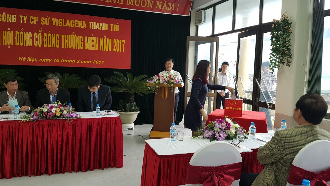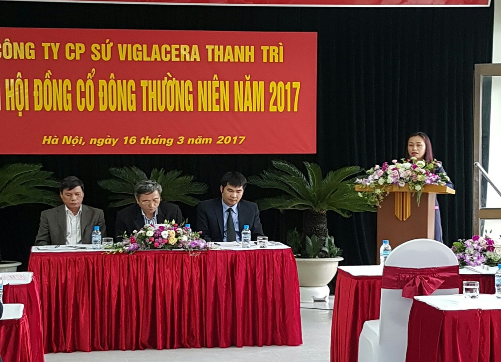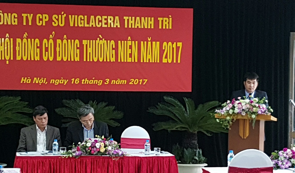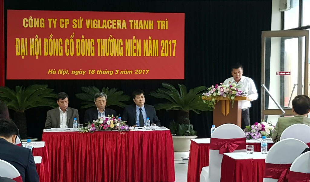 Sáng ngày 16/3/2017, Công ty cổ phần sứ Viglacera Thanh Trì đã long trọng tổ chức Đại hội đồng cổ đông thường niên 2017 tại hội trường Công ty cổ phần Sứ Viglacera Thanh Trì. Tới dự đại hội có Ông Nguyễn Minh Tuấn - Phó Tổng giám đốc Tổng Công ty Viglacera - CTCP, Chủ tịch Hội đồng quản trị Công ty cổ phần sứ Viglacera Thanh Trì; các cổ đông đại diện phần vốn điều lệ của Công ty, các thành viên Hội đồng quản trị và Ban điều hành công ty, Ban kiểm soát. Đại hội đã nghe Ông Nguyễn Thế Anh - Tổng Giám đốc Công ty cổ phần Sứ Viglacera Thanh Trì trình bày kết quả hoạt động sản xuất kinh doanh năm 2016 và kế hoạch kinh doanh năm 2017; báo cáo của Ban kiểm soát năm 2016; báo cáo của Hội đồng quản trị năm 2016 và các giải pháp chỉ đạo thực hiện KHKD năm 2017.