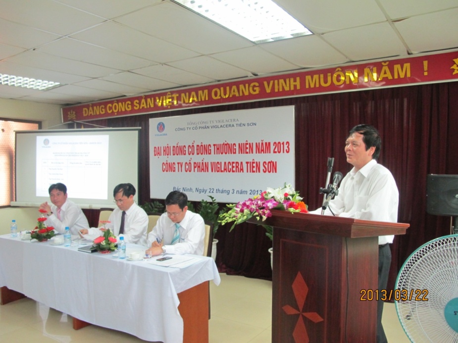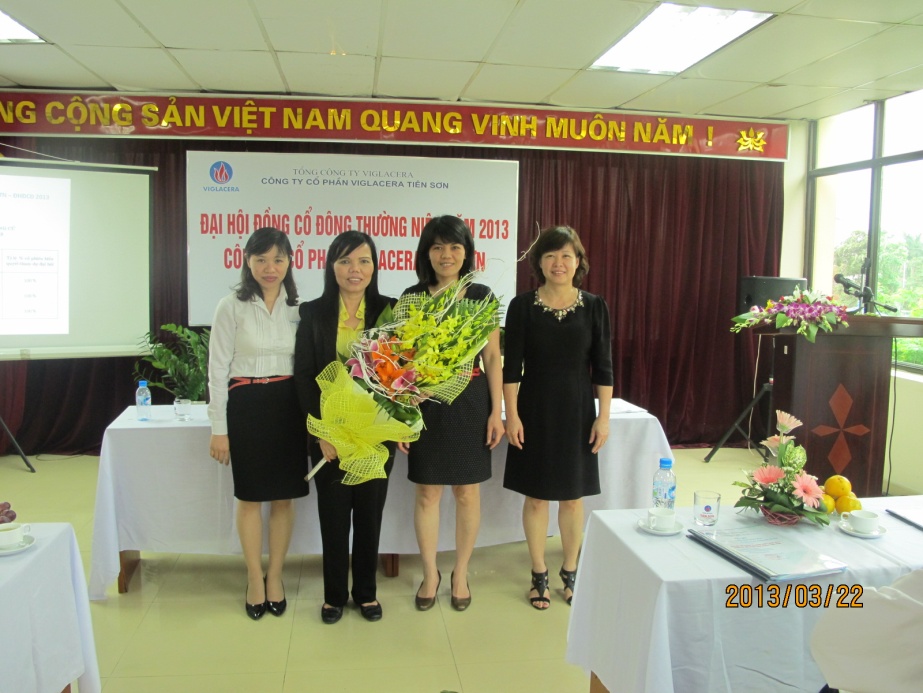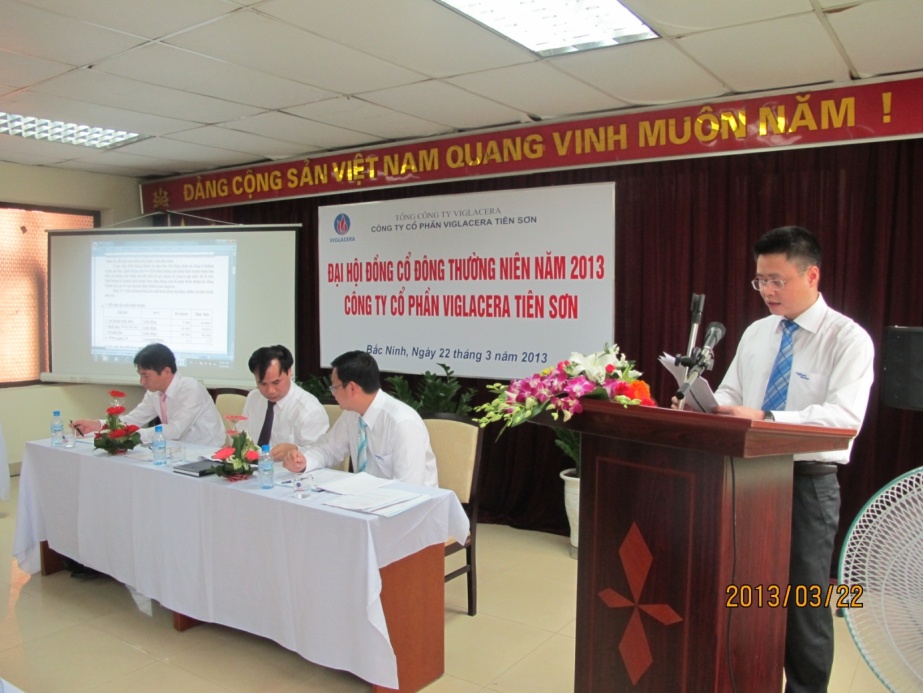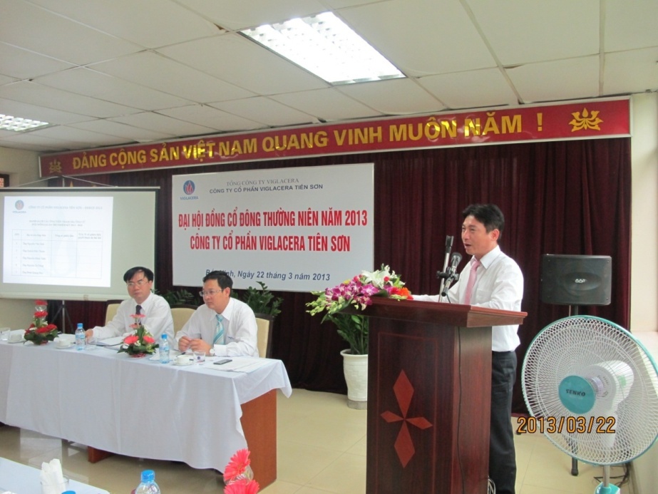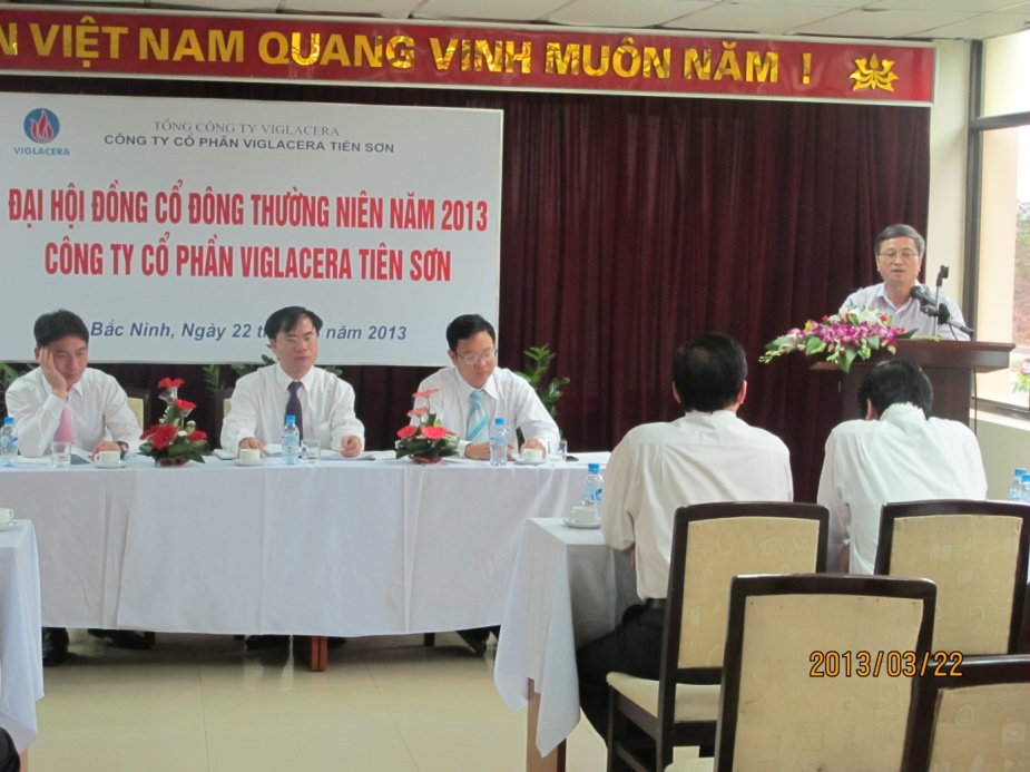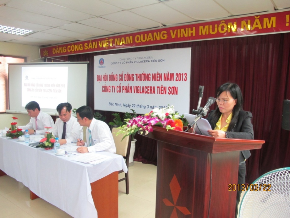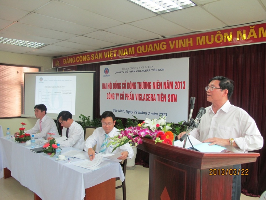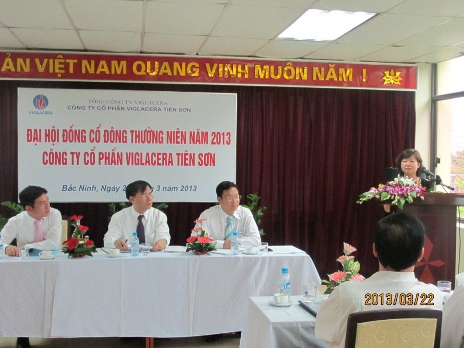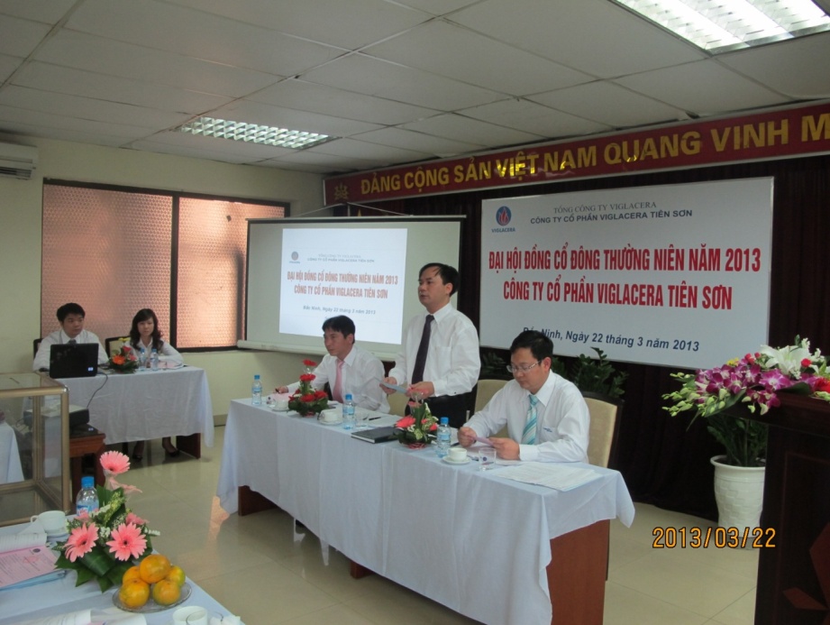 Ngày 22/3/2013, tại trụ sở Công ty Cổ phần Viglacera Tiên Sơn, KCN Tiên Sơn, huyện Tiên Du, Tỉnh Bắc Ninh đã diễn ra Đại hội cổ đông thường niên 2013. Tham dự đại hội có 72 cổ đông đại diện cho 8.729.424 cổ phần chiếm tỷ lệ 88,18% tổng số cổ phần có quyền biểu quyết.