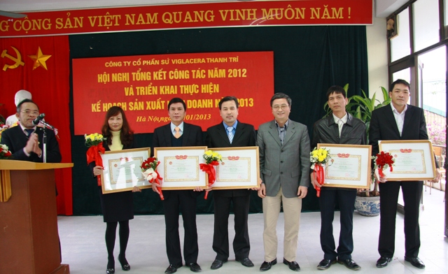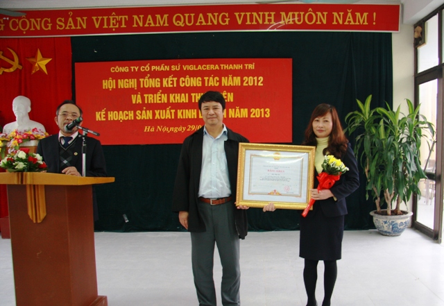 Phó TGĐ TCT - Chủ tịch HĐQT Công ty CP Sứ Viglacera Thanh Trì - Nguyễn Minh Tuấn trao Bằng khen Chiến sĩ thi đua ngành Xây dựng của BXD tại hội nghị đánh giá kết quả thực hiện kế hoạch SXKD năm 2012 và triển khai nhiệm vụ kế hoạch sản xuất kinh doanh năm 2013 cho Lãnh đạo, CBCNV