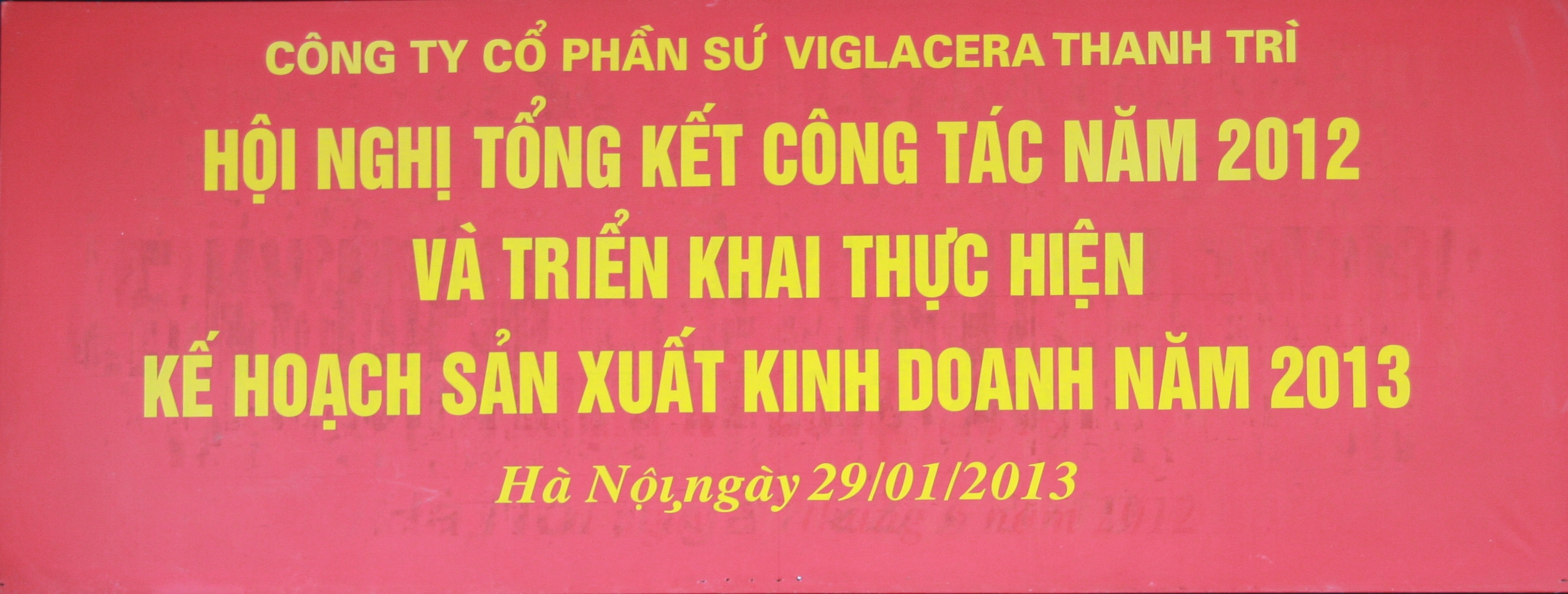 Ngày 29/01/2013, tại Hà Nội, Công ty CP Viglacera Thanh Trì đã tổ chức hội nghị đánh giá kết quả thực hiện kế hoạch SXKD năm 2012 đồng thời triển khai nhiệm vụ kế hoạch sản xuất kinh doanh năm 2013.