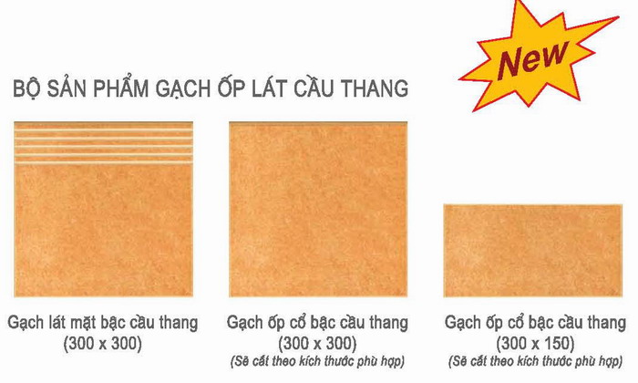 Với phương châm đa dạng hóa sản phẩm, Công ty CP Viglacera Hà nội tiếp tục đưa ra sản phẩm gạch ốp lát cầu thang với mẫu mã, kích thước 300 x 300 x 7mm, với hai sắc màu chủ đạo là vàng nhạt và vàng đỏ có bề mặt men chống trơn trượt và mài mòn