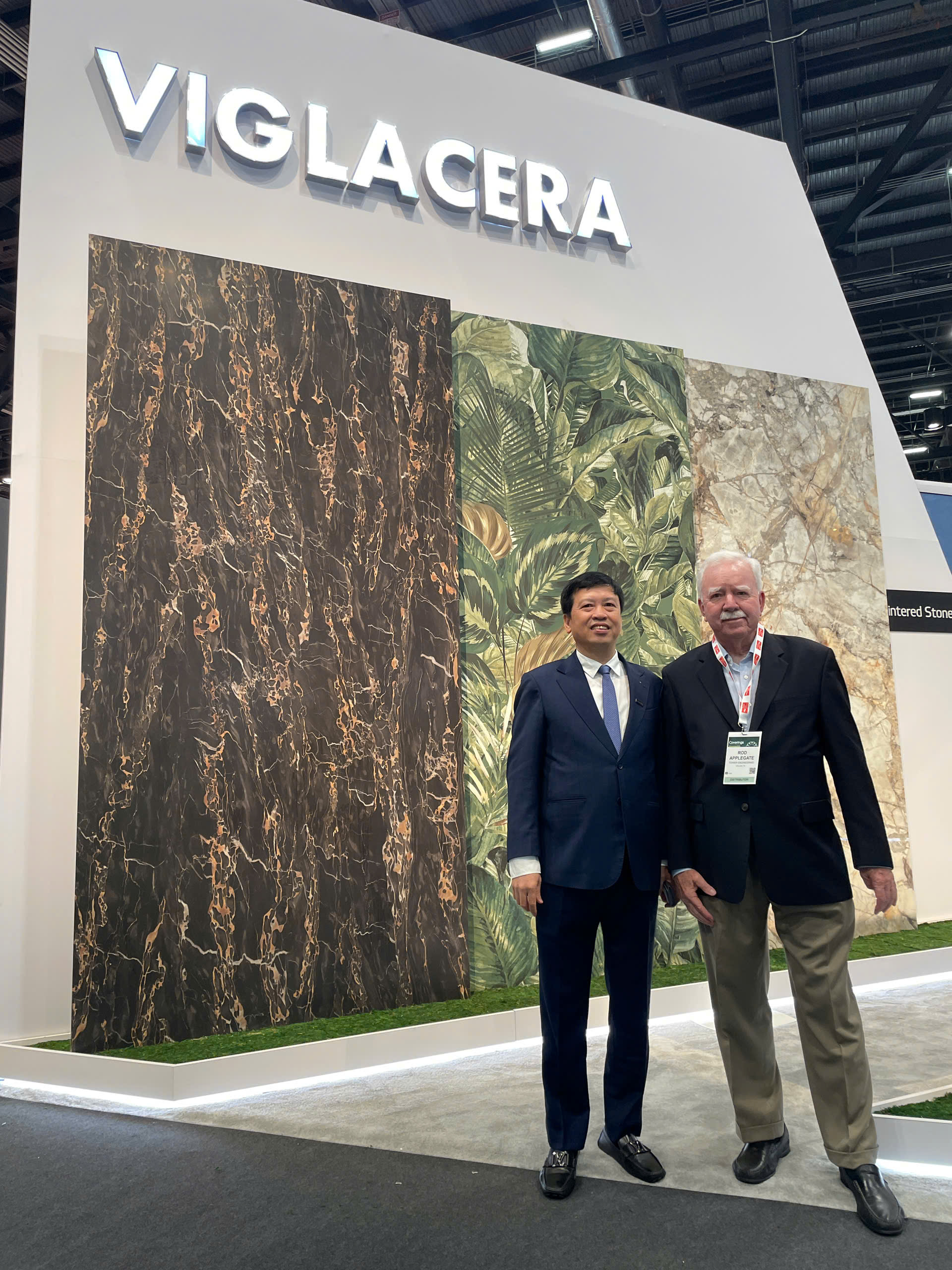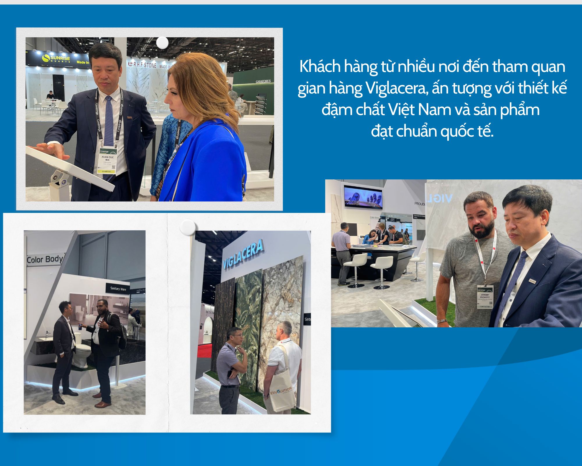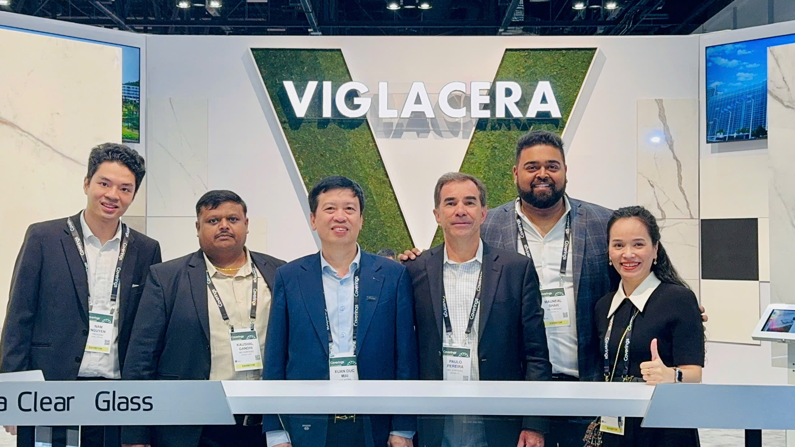 Nghe kể lại câu chuyện, ông Phan Đăng Sơn, đại diện Hội Kiến trúc sư Việt Nam đã chúc mừng tới Viglacera, ông cũng nhận xét: “Gian hàng Viglacera tại Hội chợ Coverings 2025 có thiết kế tinh tế, mang dấu ấn Việt Nam cởi mở và giàu bản sắc. Cách bài trí sản phẩm hiện đại, thông minh, khéo léo cân bằng giữa tính thẩm mỹ và công năng, nói đúng là vượt xa 60-70% các gian hàng khác vốn còn đơn giản và thiếu điểm nhấn. Gian hàng năm nay không chỉ là nơi trưng bày sản phẩm, mà còn là lời khẳng định mạnh mẽ cho tầm vóc và khát vọng vươn xa của Viglacera, đúng dịp kỷ niệm 50 năm thống nhất đất nước.”