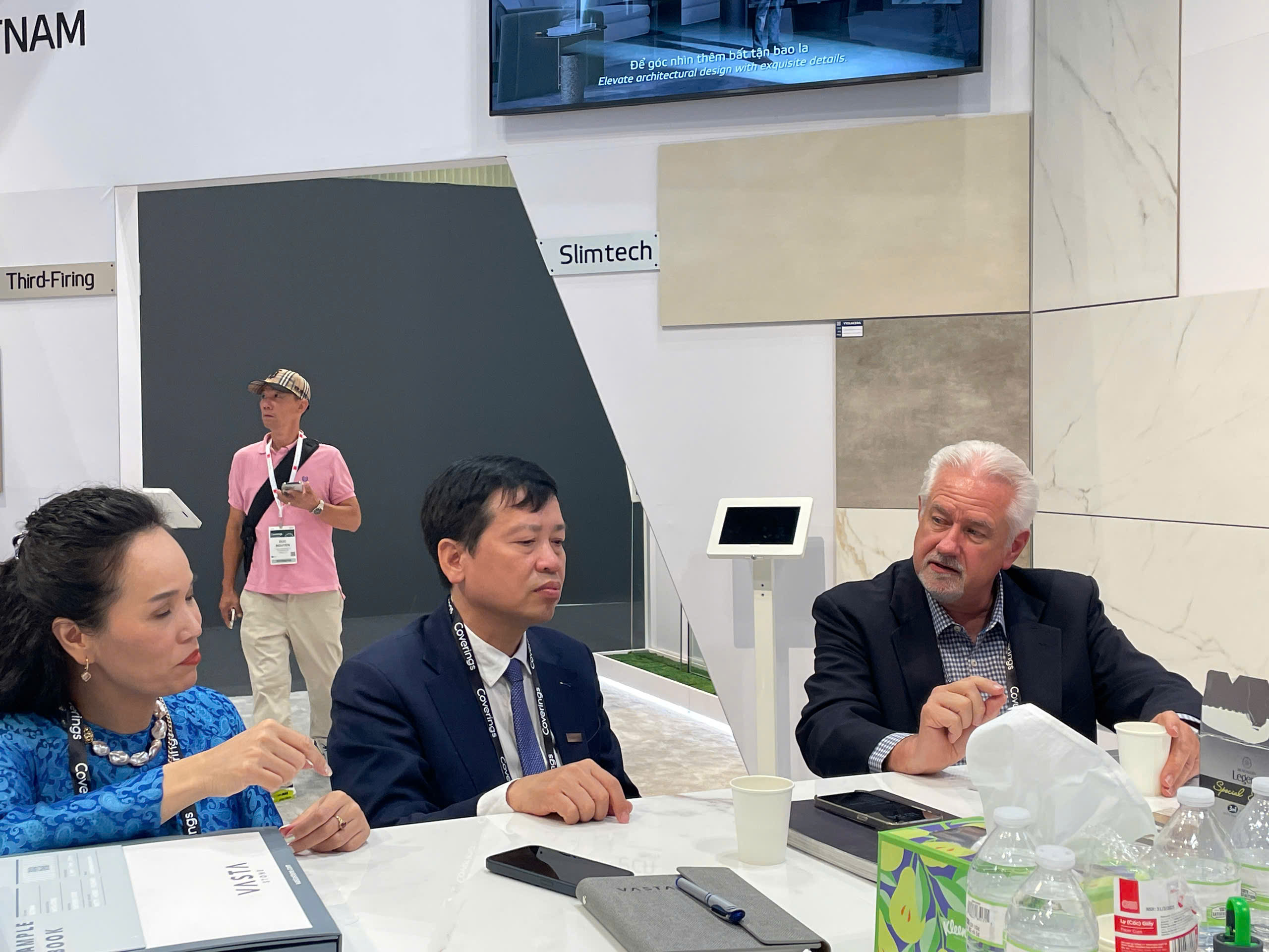 Mr Gregg - Phó Chủ tịch Daltile đến làm việc tại gian hàng Viglacera, bàn về các giải pháp nếu bị tăng thuế