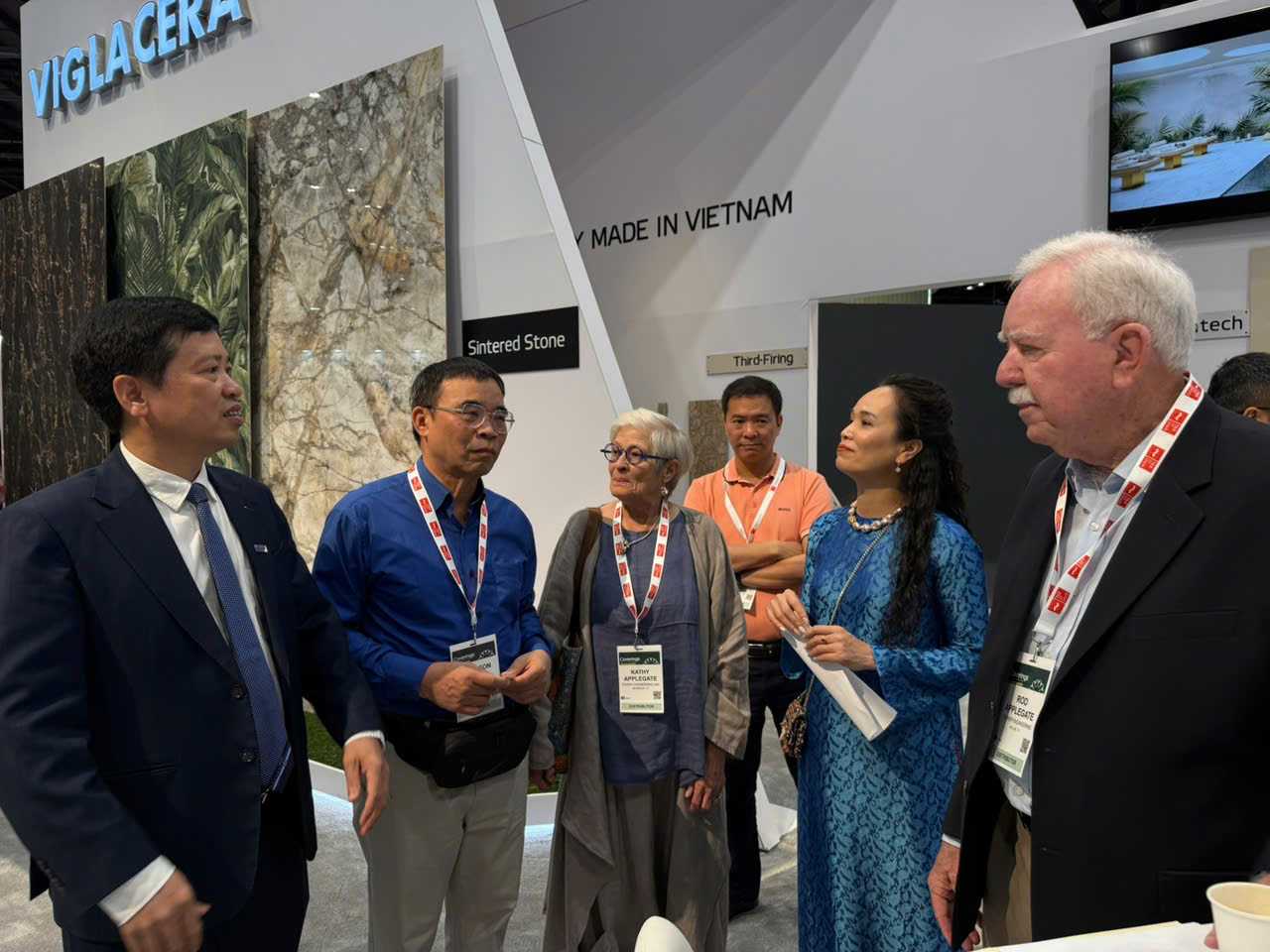 Những bạn hàng của Viglacera trên đất Mỹ cũng tới chúc mừng. “Gian hàng của các bạn năm nay đặc sắc hơn nhiều so với năm trước, chúng tôi rất là ấn tượng với sản phẩm Đá nung kết vân xuyên xương của các bạn"- Mrs. Tammy, phụ trách về Kế hoạch và sản phẩm của Công ty Daltile nói.