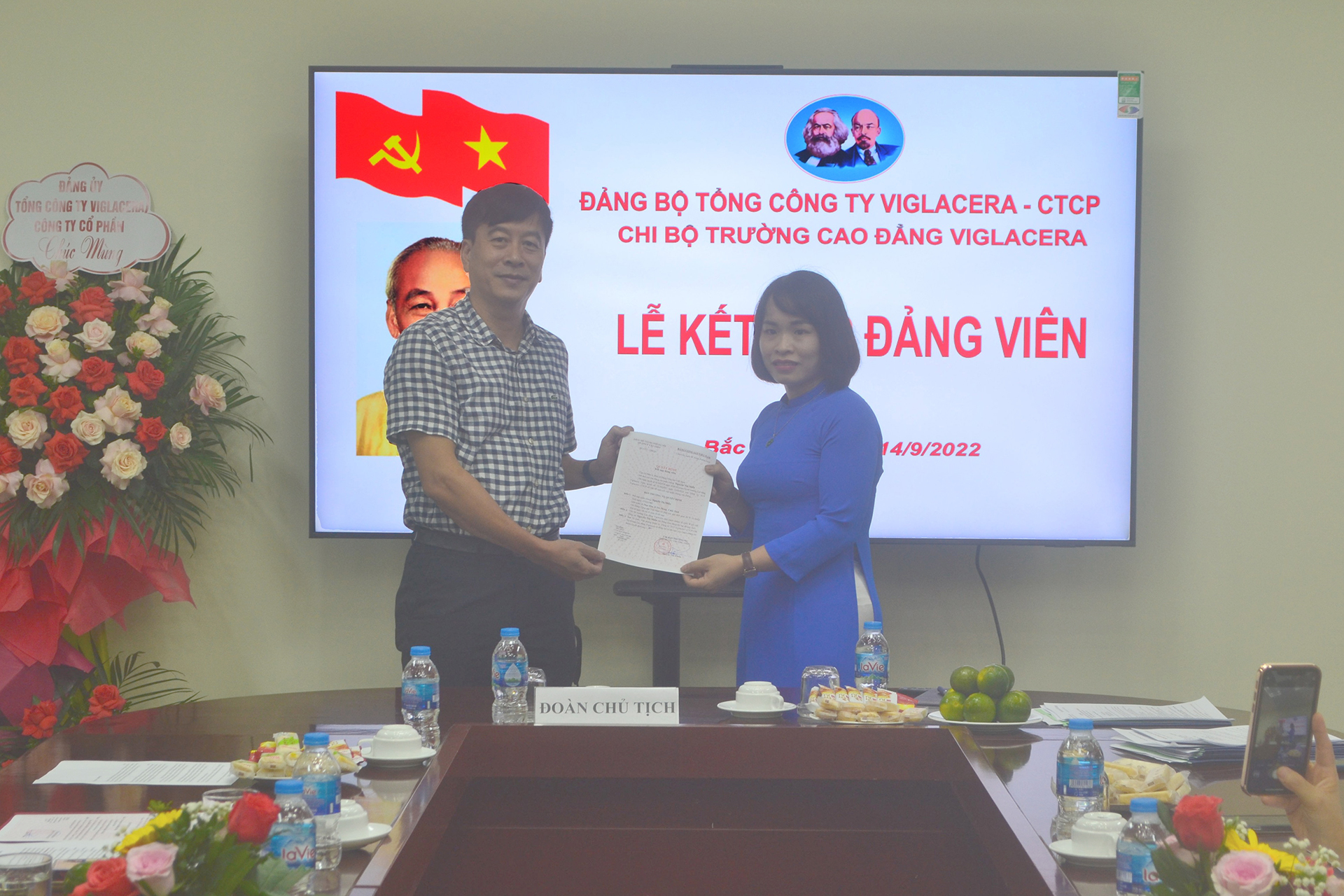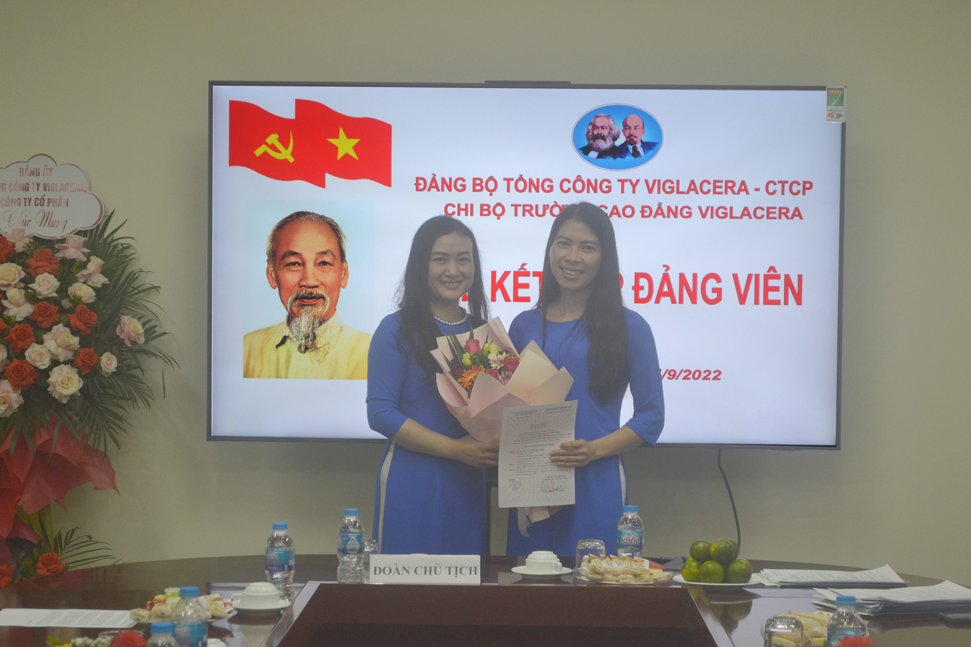 Cũng trong sáng ngày 14/09/2022, trước khi tổ chức Đại hội chi bộ nhiệm kỳ 2022-2025 diễn ra, Chi bộ Trường Cao đẳng Viglacera đã tổ chức Lễ kết nạp Đảng cho 02 quần chúng ưu tú là đồng chí Nguyễn Thị Miến và đồng chí Đào Thu Thuỷ. Buổi lễ kết nạp đã diễn ra trang trọng theo đúng quy định của Đảng.