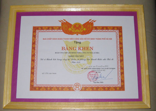 Đoàn Thanh niên TCT Viglacera được Thành đoàn tặng Bằng khen năm 2010