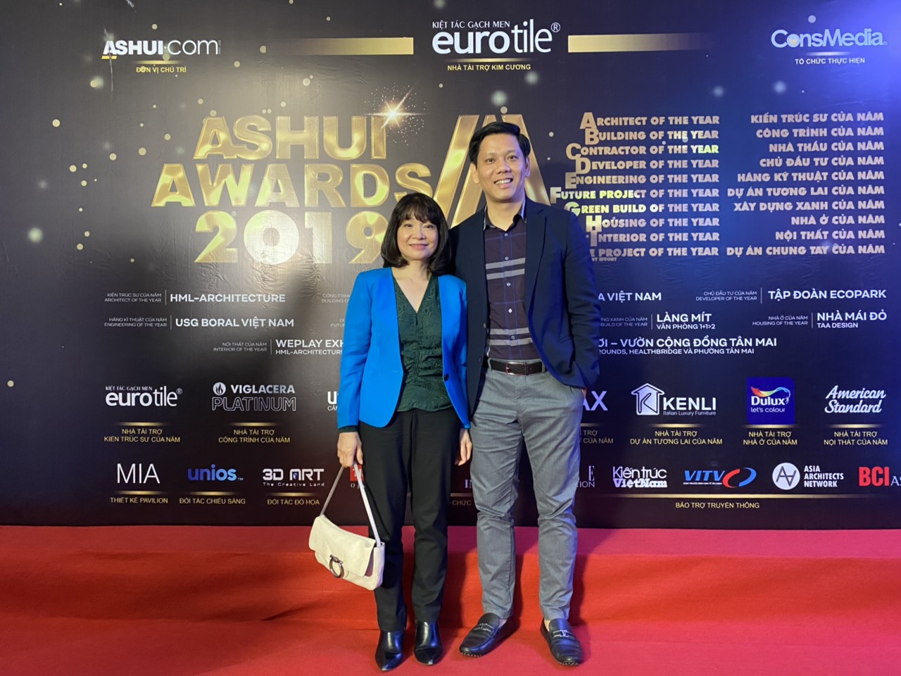 Bà Nguyễn Thị Duyên - Chủ tịch Hiệp hội Tư vấn Xây dựng Việt Nam và ông Nguyễn Mạnh Hiếu - Đại diện thương hiệu Eurotile tại Ashui Awards 2019
