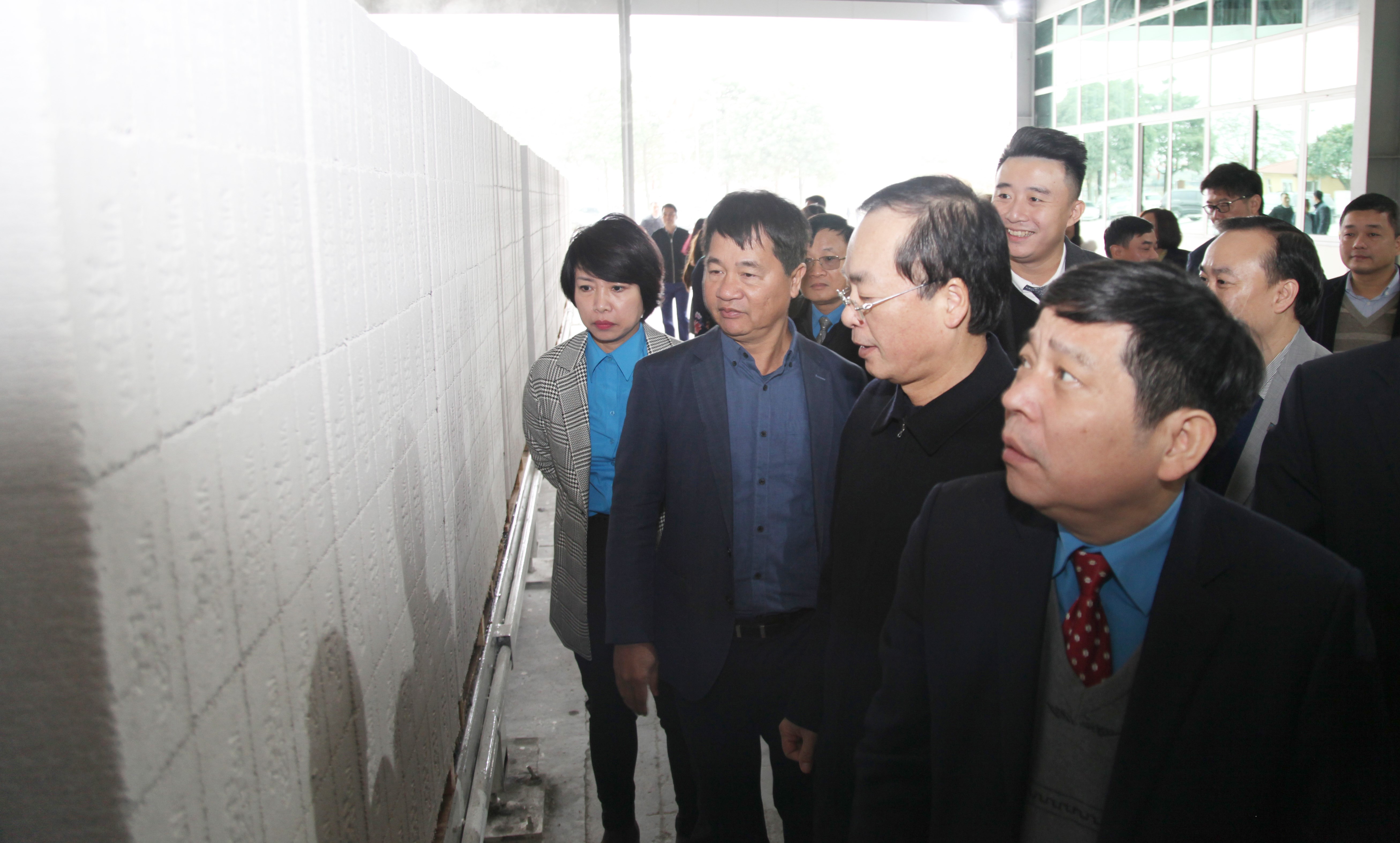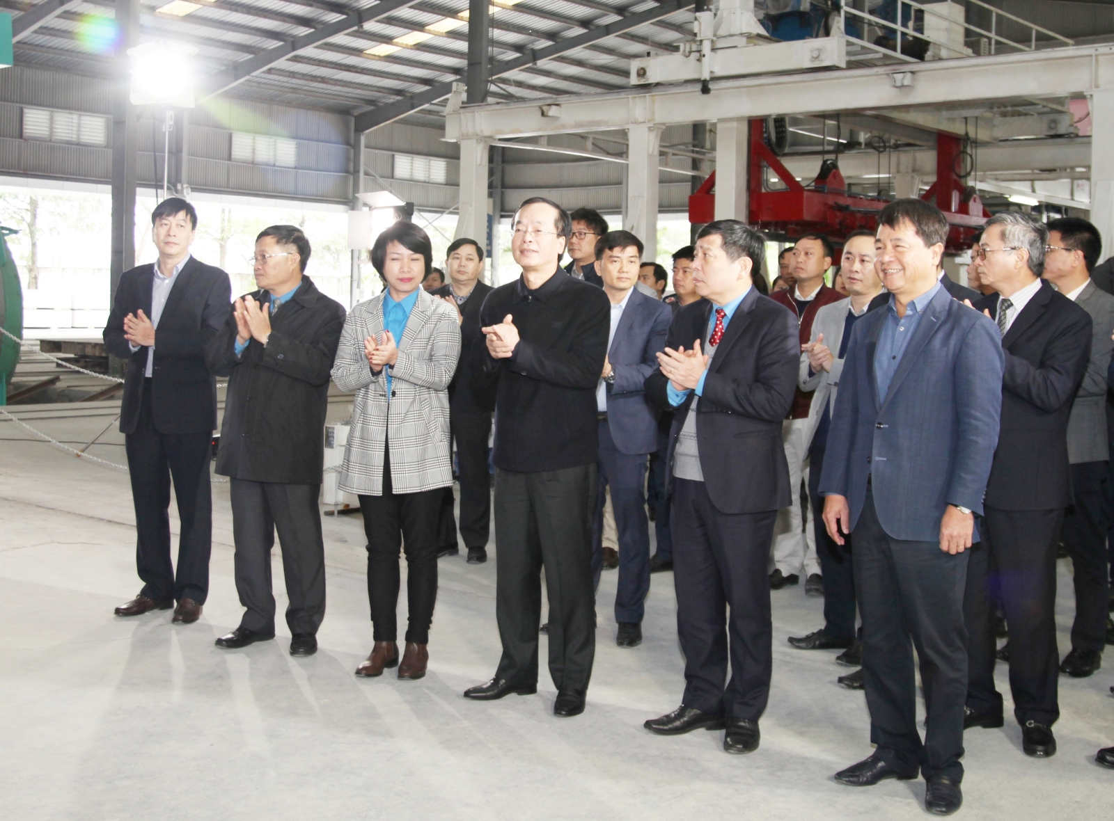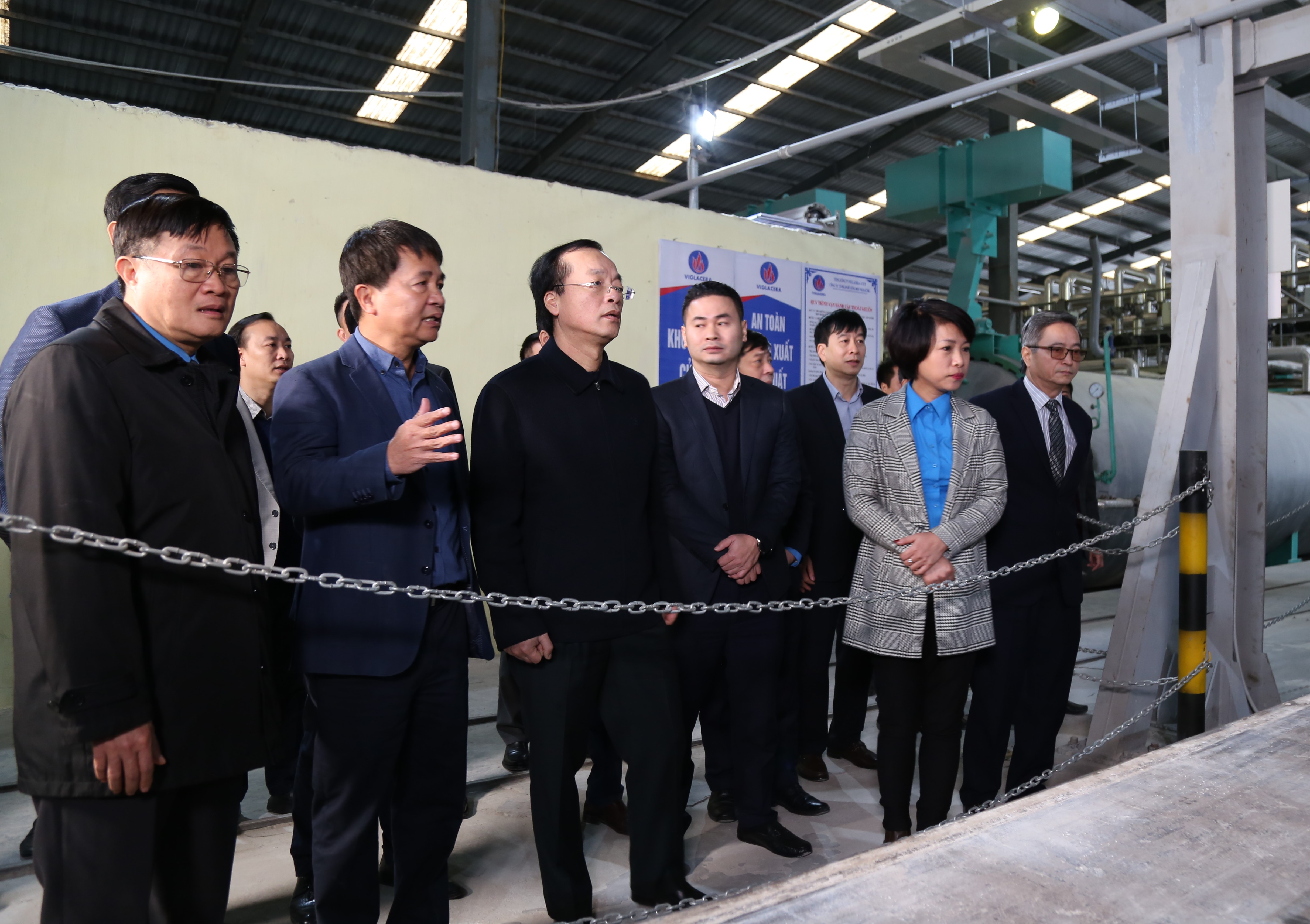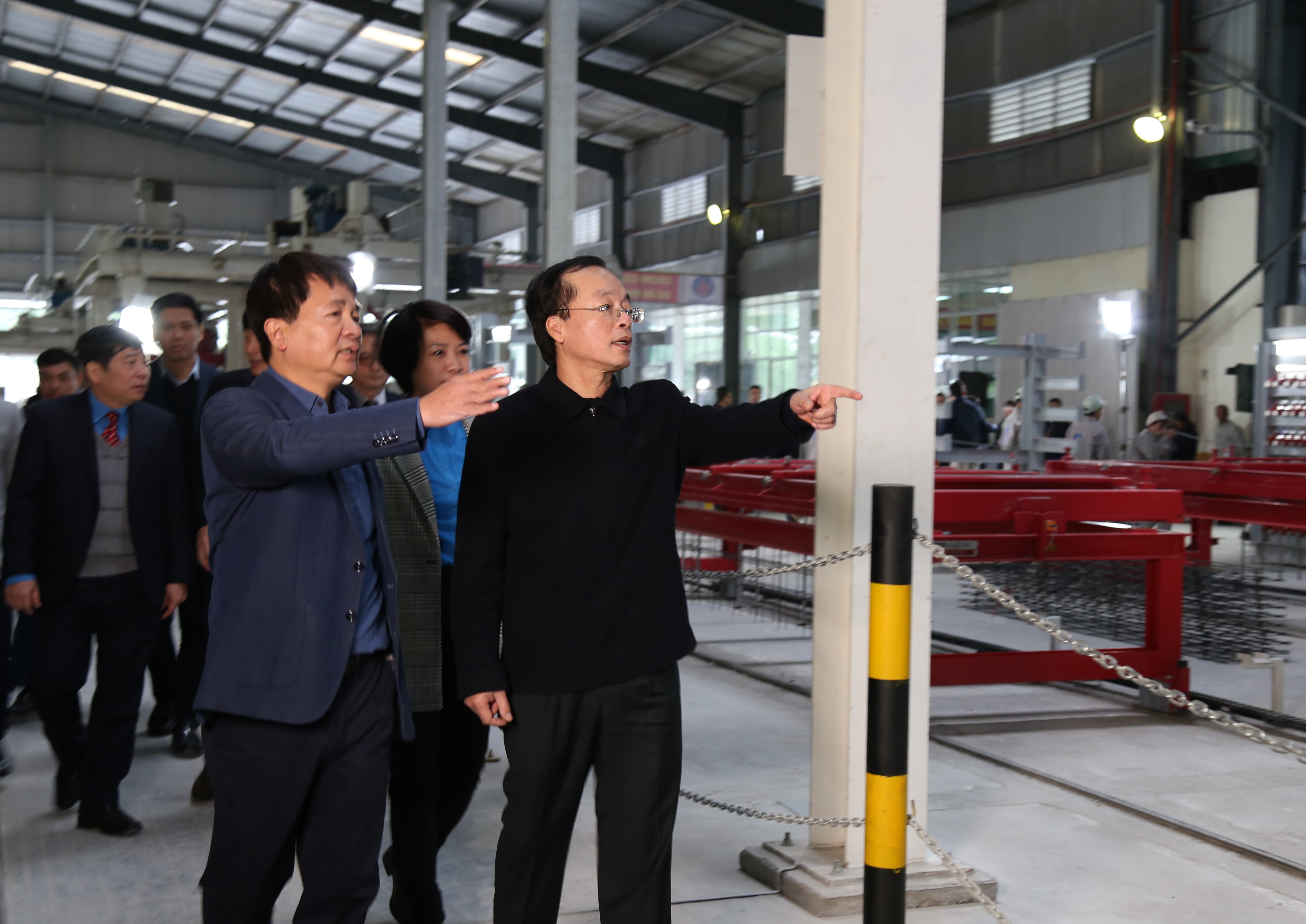 Bộ trưởng Bộ Xây dựng Phạm Hồng Hà, Chủ tịch Công đoàn xây dựng Việt Nam Nguyễn Thị Lệ Thủy cùng Lãnh đạo Tổng công ty Viglacera thăm dây chuyền nhà máy Gạch bê tông khí Viglacera