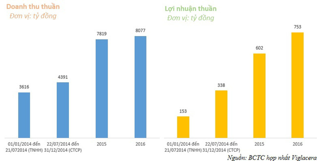 Theo báo cáo tài chính năm 2016 của Viglacera, công ty đạt mức tăng trưởng cao nhất từ trước đến nay. Doanh thu hợp nhất đạt 8.078 tỷ tăng 3,3% đặc biệt là lợi nhuận trước thuế đạt 766 tỷ tăng 46,2% so với 2015. Trong khi, các chi phí như chi phí bán hàng, chi phí quản lý lại không tăng nhiều. Điều này dẫn tới biên lợi nhuận gộp 2016 của Viglacera khá tốt đạt 24,6% tăng 2,6% so với năm ngoái.