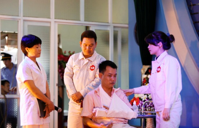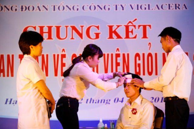 Thế nhưng, có những phần thi mà nữ bác sĩ tận tình ấy chỉ có thể cười và gật đầu khen ngợi về màn thao tác sơ cứu băng bó cố định vết thương hết sức chuyên nghiệp của những cô “y sĩ – công nhân” giỏi giang như trường hợp Lê Thu Huyền (Cty Viglacera Thanh Trì, Nguyễn Thu Trang – Cty Viglacera Hạ Long)…