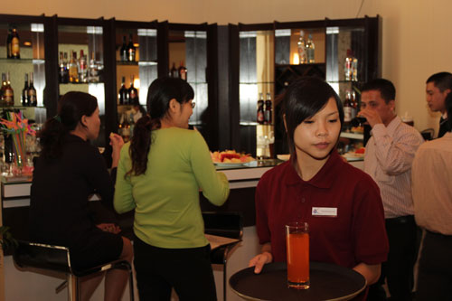 Trong không gian ấm cúng, quan khách được nhâm nhi những ly rượu vang và thưởng thức các món ăn Á – Âu do nhân viên nhà hàng thực hiện.