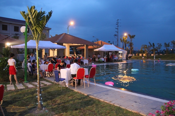 Đến với lễ khánh thành, các khách mời không chỉ được thỏa thích vui chơi mà còn được thưởng thức một bữa tiệc buffet ngoài trời ấm cúng và lịch sự. Khu vực phục vụ đồ ăn được bố trí ngay sát bể bơi và gần sân khấu chính, bởi vậy, mọi khách mời đều có thể vừa thưởng thức đồ ăn, vừa xem chương trình biểu diễn ca nhạc và hài kịch. Những cháu nhỏ rất hào hứng hò hét, cổ vũ và cùng bò lăn ra cuời với sự pha trò hóm hỉnh của chú Thành Trung…