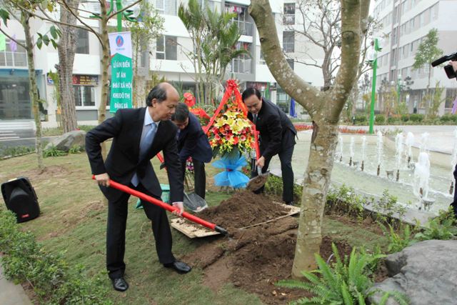 Thứ trưởng Bộ Xây dựng Nguyễn Trần Nam, Phó Chủ tịch TP. Hà Nội Nguyễn Ngọc Tuấn và Tổng giám đốc TCT Viglacera - CTCP Nguyễn Anh Tuấn trồng cây lưu niệm tại dự án