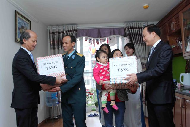 Thứ trưởng Bộ Xây dựng Nguyễn Trần Nam, Phó Chủ tịch TP. Hà Nội Nguyễn Ngọc Tuấn thăm và tặng quà cho các gia đình tại Khu NƠXH giai đoạn 3 Đặng Xá - D17