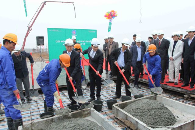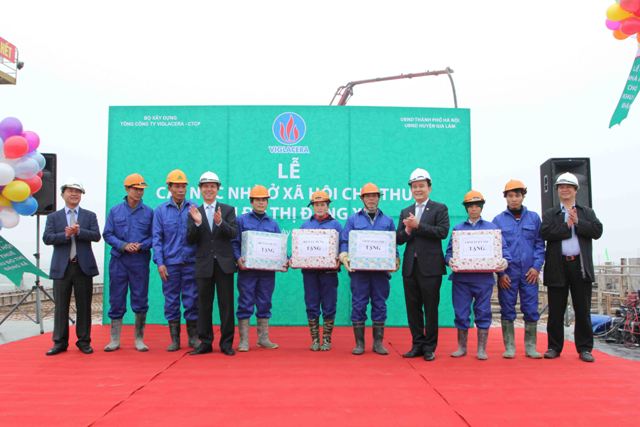 Thứ trưởng Bộ Xây dựng Nguyễn Trần Nam, Phó Chủ tịch TP. Hà Nội Nguyễn Ngọc Tuấn và Chủ tịch HĐQT TCT Viglacera - CTCP Luyện Công Minh tham dự Lễ cất nóc Khu NƠXH cho thuê tại giai đoạn 3 Đặng Xá và thăm hỏi, động viên công nhân đang thi công trên công trường