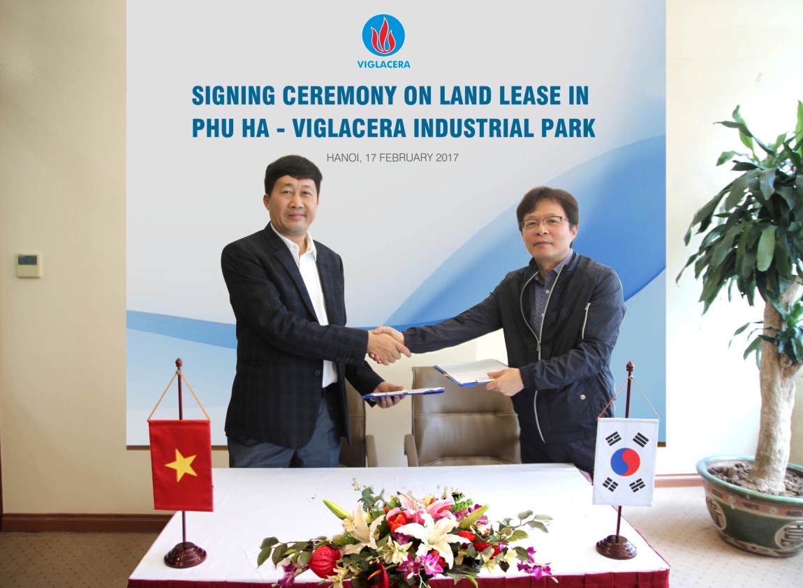 Ông Trần Ngọc Anh – Giám đốc công ty Kinh doanh BĐS Viglacera và Ông Moon Soojin – Giám đốc Công ty Davo C&M ký hợp đồng thuê đất KCN Phú Hà