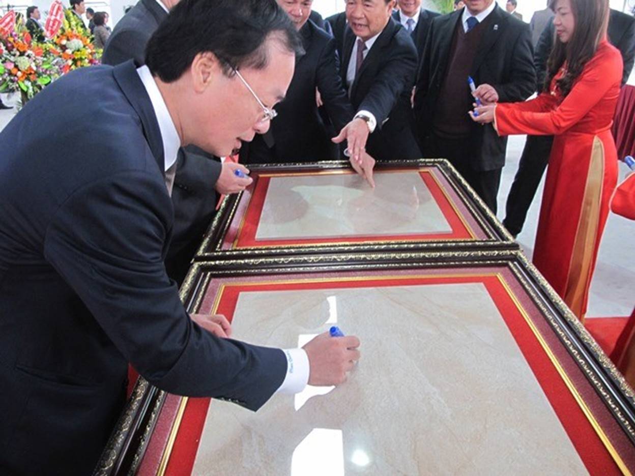 Bộ trưởng Phạm Hồng Hà vui mừng trước một sản phẩm vật liệu tiết kiệm năng lượng do Viglacera sản xuất.