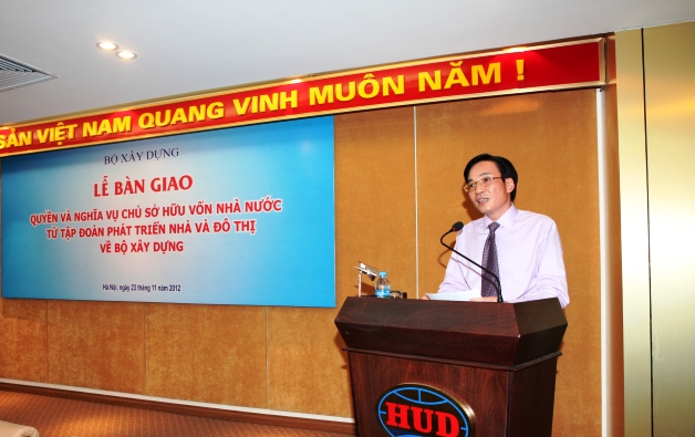 Thực hiện Quyết định số 1428/QĐ-TTg của Thủ tướng Chính phủ về việc kết thúc thí điểm hình thành Tập đoàn CNXD Việt Nam và Tập đoàn Phát triển Nhà và Đô thị Việt Nam, giao Bộ Xây dựng chỉ đạo công tác tổ chức, cán bộ, chuyển quyền quản lý phần vốn nhà nước tại các Tổng công ty, đảm bảo phát triển SXKD của các doanh nghiệp thuộc Bộ, ngày 23/11/2012 tại tòa nhà M5, trụ sở Tổng công ty HUD, 91 Nguyễn Chí Thanh Bộ Xây dựng đã chủ trì buổi lễ bàn giao quyền và nghĩa vụ chủ sở hữu vốn Nhà nước từ Tập đoàn Phát triển nhà và đô thị (HUD) về Bộ Xây dựng.