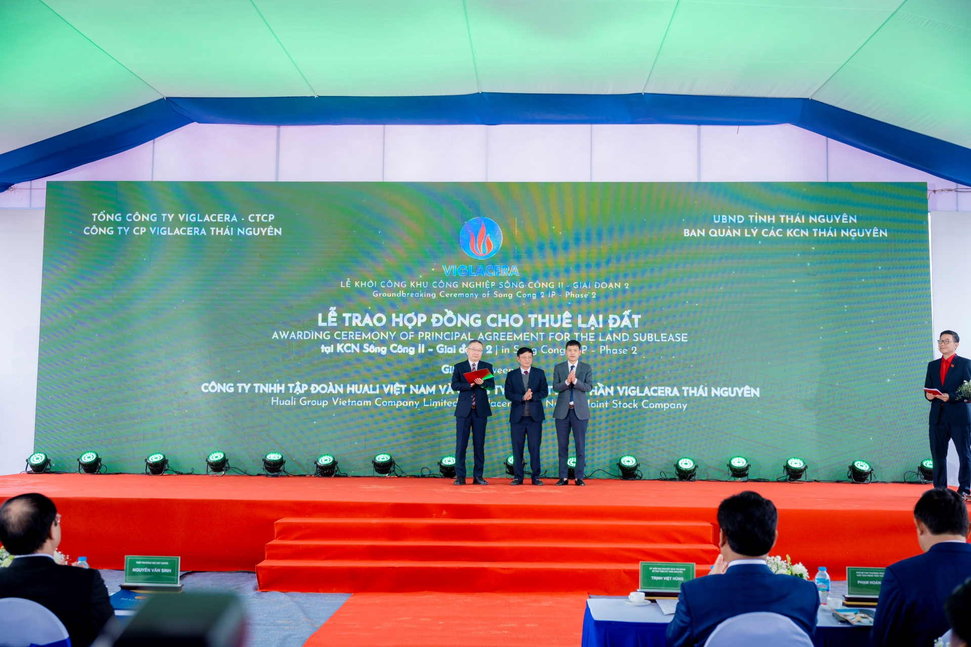 Một phần quan trọng trong buổi lễ là nghi thức ký kết hợp đồng cho thuê đất tại KCN Sông Công II – Giai đoạn 2. Ông Lê Ngọc Ước – Giám đốc Công ty CP Viglacera Thái Nguyên và ông Henry Xu Xu Hong Bing – Phó Tổng Giám đốc Công ty TNHH Tập đoàn Huali Việt Nam đã ký kết hợp đồng hợp tác.