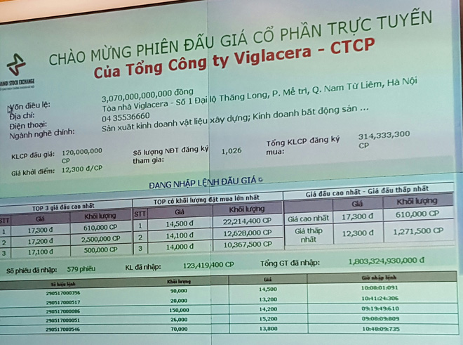 Sáng ngày 29/5, Tổng công ty Viglacera (mã VGC) tổ chức phiên đấu giá 120 triệu cổ phần trên Sở giao dịch chứng khoán Hà Nội. Trong đó hơn 81,3 triệu cổ phần (tương đương 67,75% tổng số cổ phiếu đăng ký phát hành) được phát hành theo hình thức bảo lãnh chắc chắn.