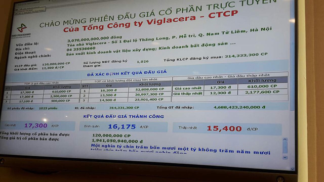 [Live] Đấu giá Viglacera: Giá trúng bình quân 16.175 đồng/cp, 91,65% thuộc về nhà đầu tư nước ngoài