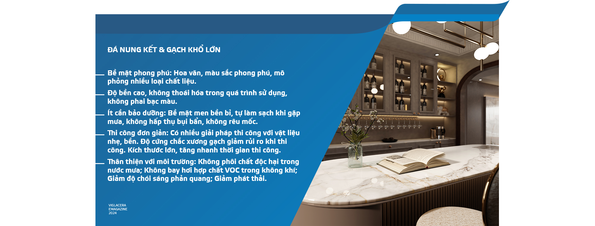 Kích thước “siêu to” so với đa phần các sản phẩm khác trên thị trường, nhưng chiều dày sản phẩm linh động từ 6mm - 10mm - 20mm đã tạo ra một sản phẩm ốp lát mới phá vỡ mọi giới hạn rào cản về thiết kế, mang đến nét phóng khoáng cho không gian công trình.