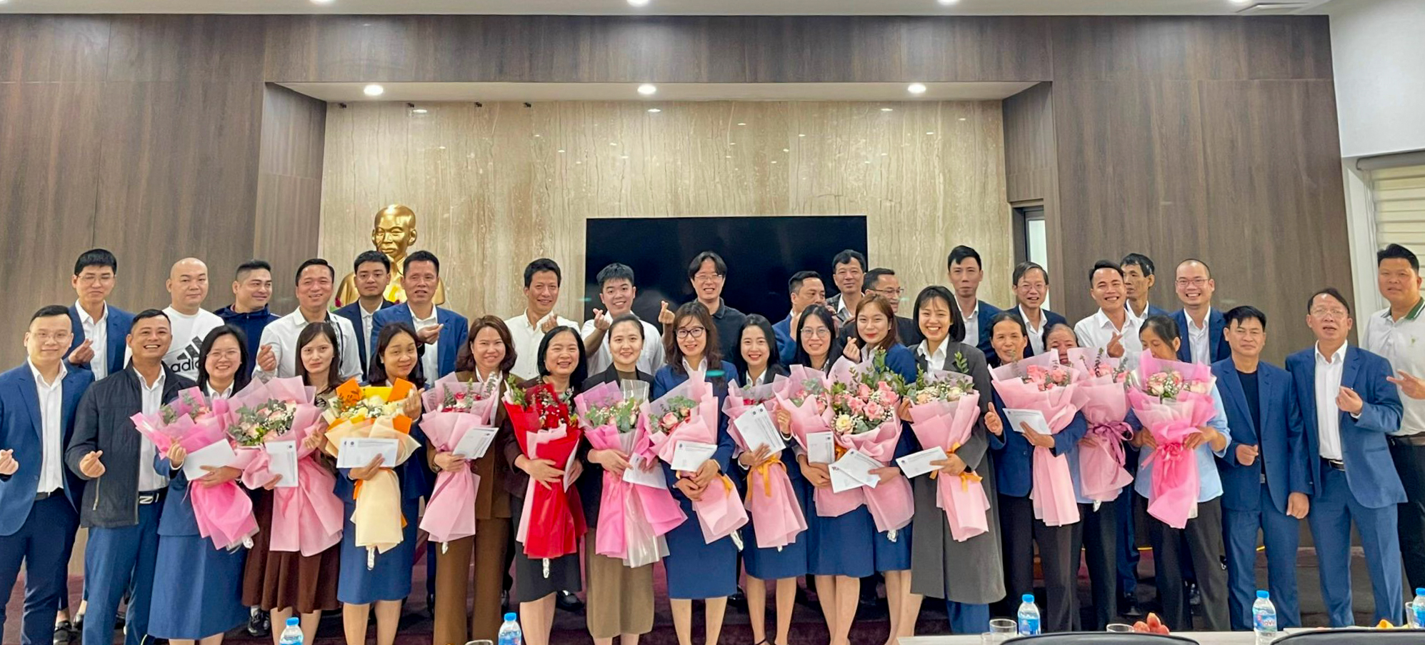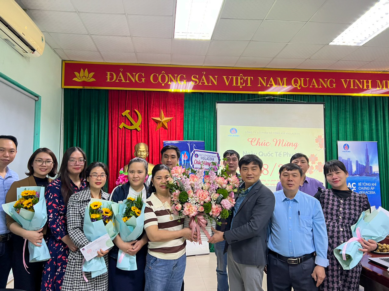 Các nữ đoàn viên người lao động của Công ty Đầu tư Hạ tầng Viglacera vui mừng đón nhận những bó hoa tươi thắm từ cán bộ lãnh đạo Công ty. Tại đây, nữ giới chiếm tỷ lệ lao động khá cao và cũng là đơn vị có nhiều thành tựu xuất sắc, đóng góp vào thành tích chung của Công ty nói riêng cũng như TCT Viglacera