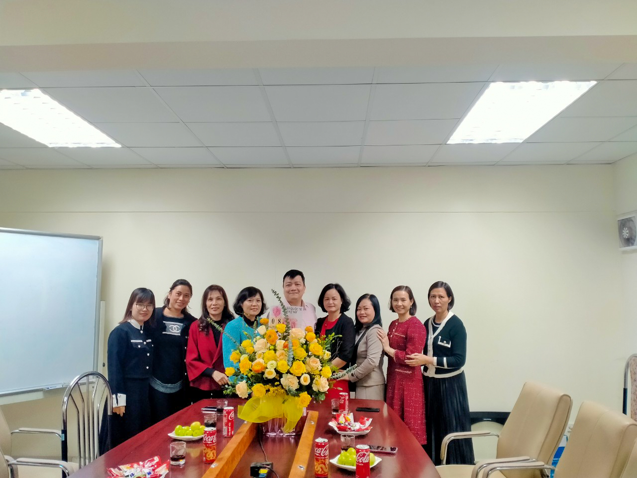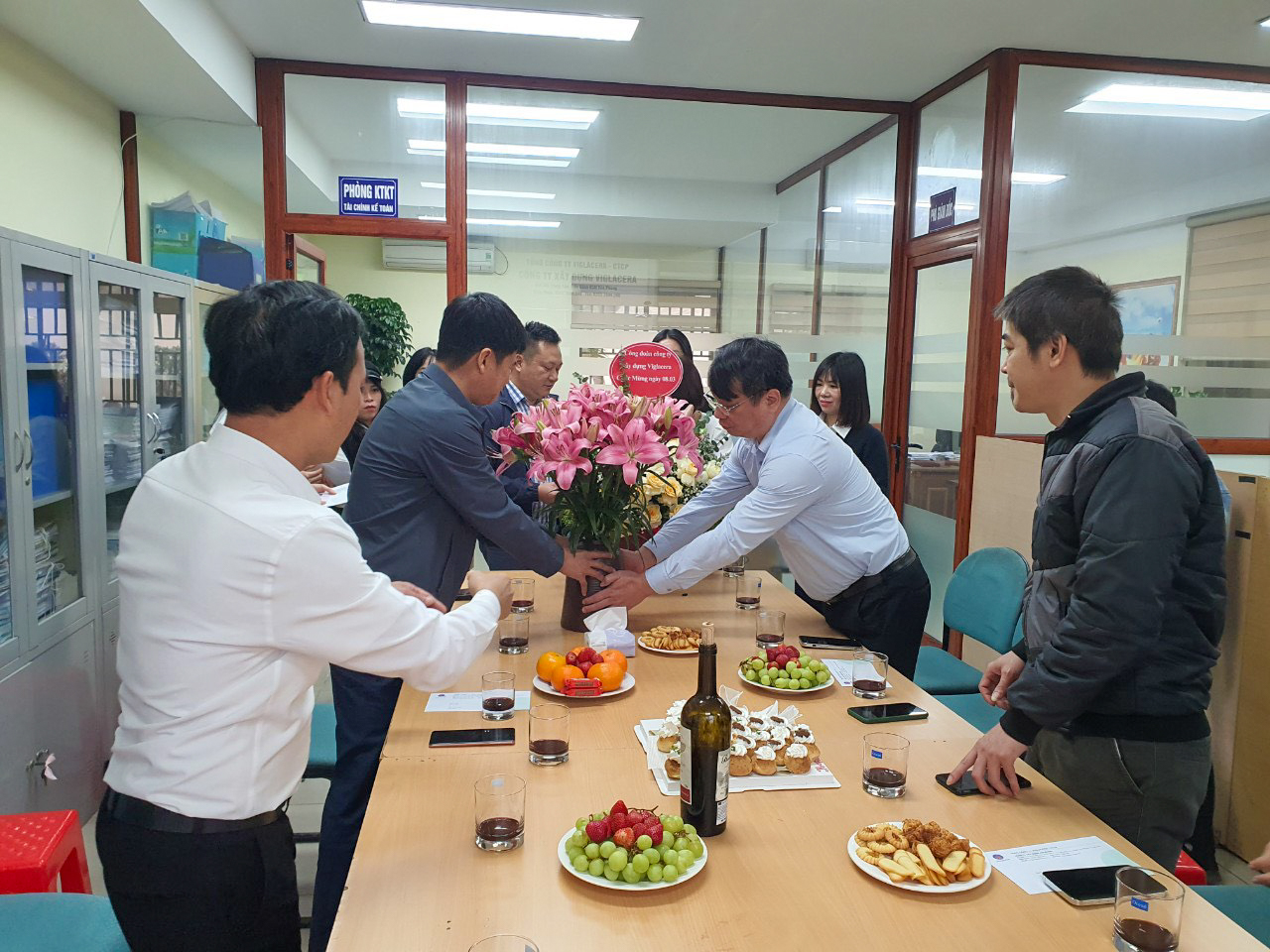 Cánh mày râu trực tiếp cắm những lọ hoa tươi thắm và trang trí bàn tiệc để chúc mừng chị em phụ nữ lao động trong Công ty Xây dựng Viglacera