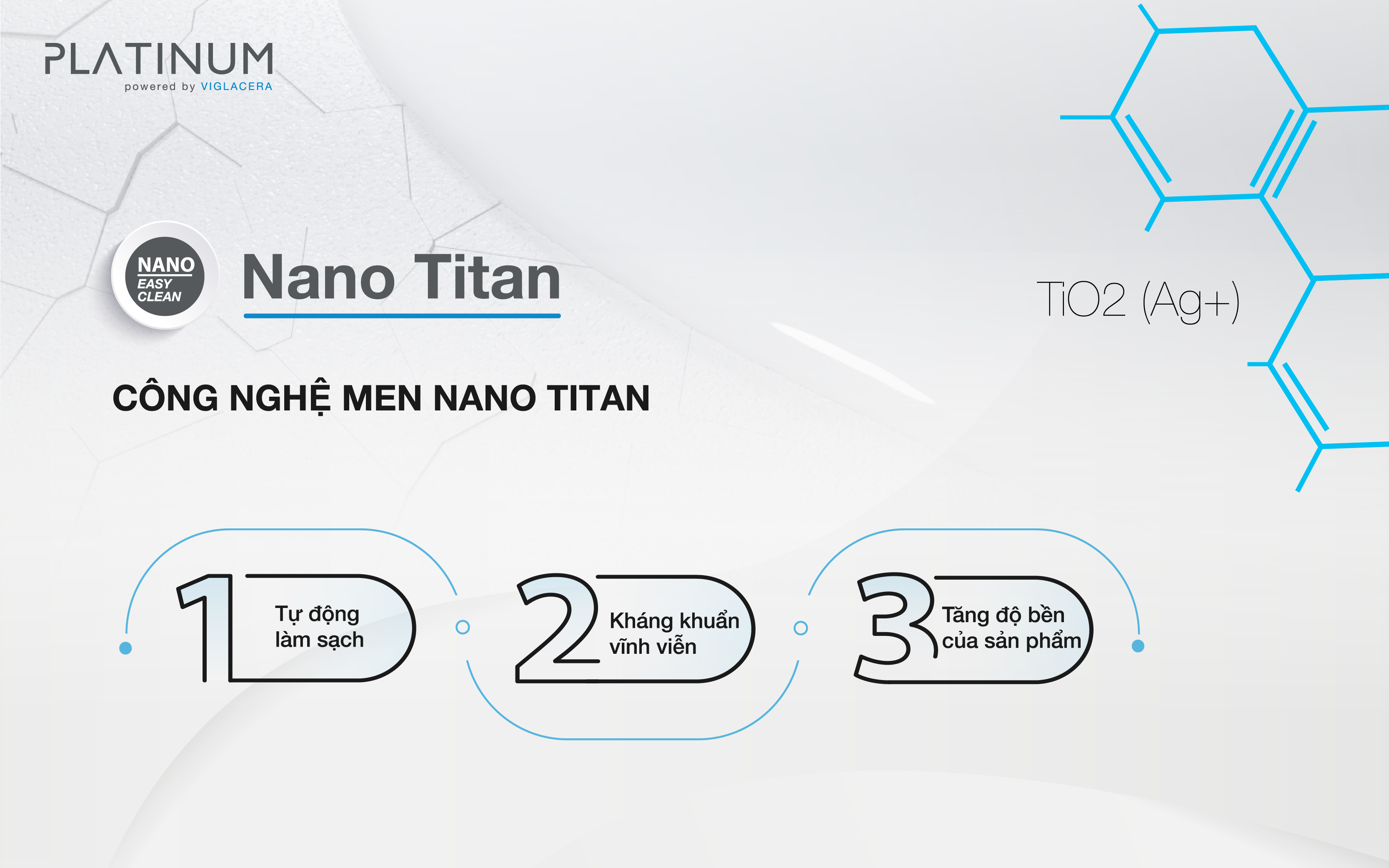 Nano Titan là loại men độc quyền của Viglacera theo công nghệ Châu Âu, lần đầu tiên có mặt tại Việt Nam. Lớp men Nano Titan phủ bạc vừa có công dụng kháng khuẩn tới 89% (theo nghiên cứu của viện Pasteur), vừa có khả năng chống thấm, chống bám dính, tự làm sạch hiệu quả. Đặc biệt, lớp men được thủy tinh hóa gắn chặt lên bề mặt sản phẩm, giữ cho lớp men bền lâu và chống bị rửa trôi.
