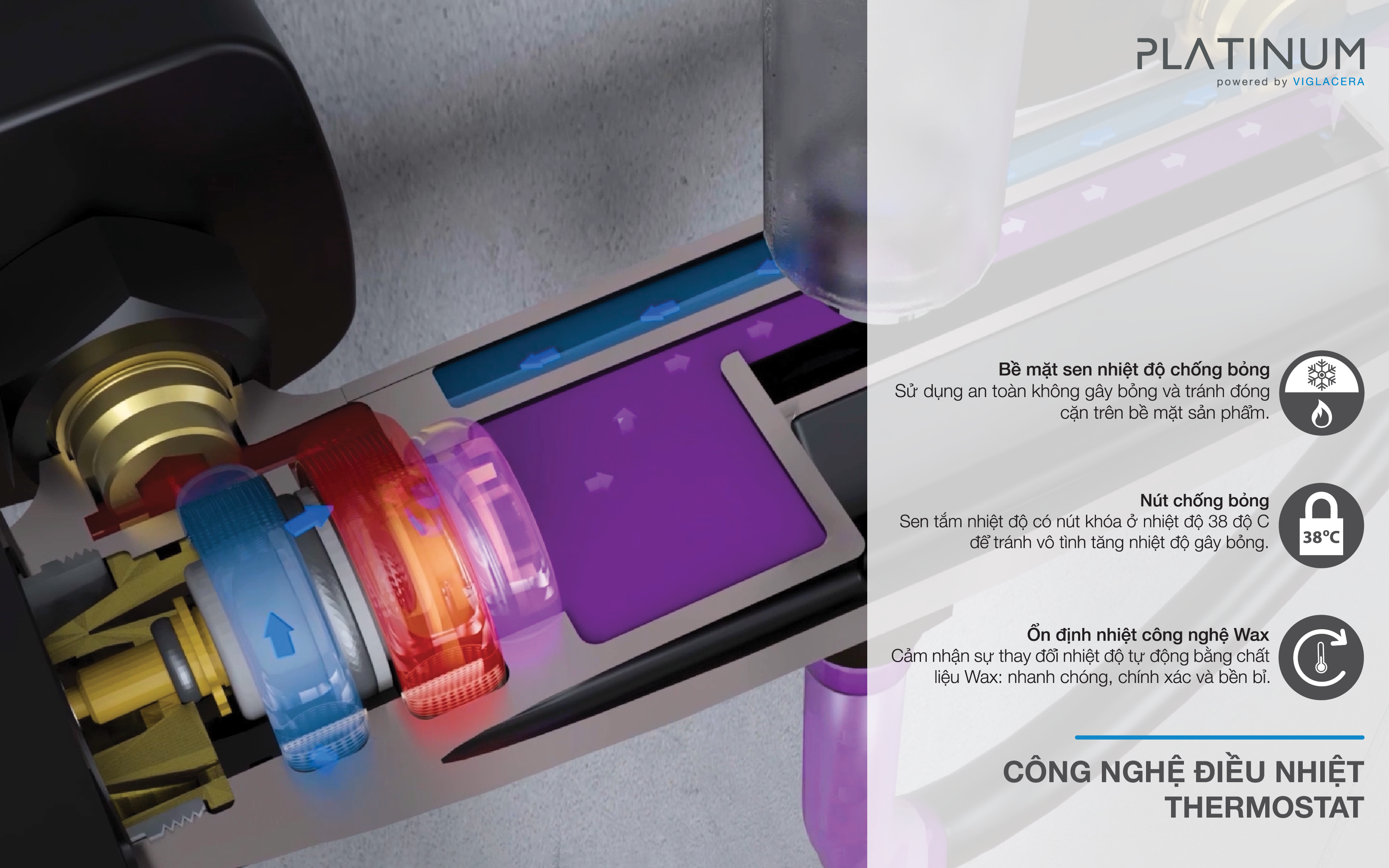 Thermostat là công nghệ sử dụng lõi điều nhiệt bằng chất liệu sáp (WAX) từ Châu Âu, cho phép cụm điều nhiệt giãn nở co ngót cực nhanh và chính xác. Sản phẩm có lõi trộn nhiệt công nghệ Thermostat hoạt động siêu nhạy và bền lâu, ổn định nhiệt độ nguồn nước với thời gian dưới 1 giây, tránh trường hợp bị bỏng do nước quá nóng hoặc sốc nhiệt do nước quá lạnh.