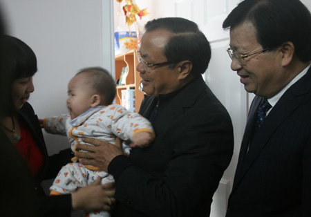 Bí thư Thành ủy Phạm Quang Nghị và Bộ trưởng BXD Trịnh Đình Dũng thăm và tặng quà gia đình anh Đinh Văn Trung (ở căn hộ 229 khu nhà D7) vừa dọn đến ở trong căn hộ nhà ở xã hội khu đô thị Đặng Xá giai đoạn 2
