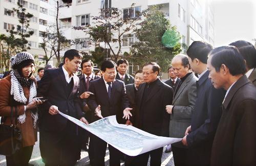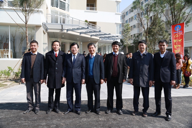 Bộ Trưởng Trịnh Đình Dũng cùng lãnh đạo Viglacera trước khu nhà NƠ05 vừa được hoàn thiện trước Tết Giáp Ngọ 2014