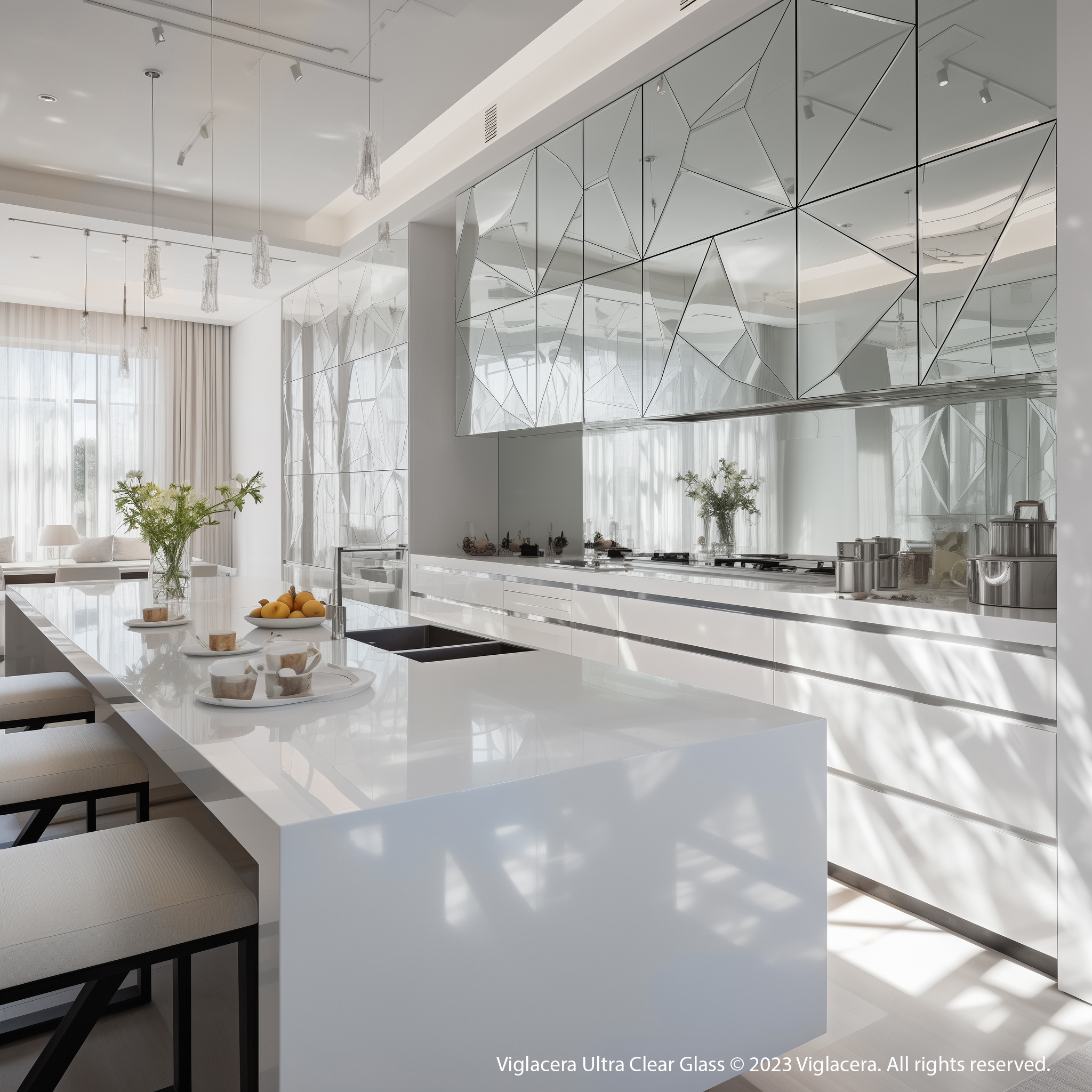 Kính siêu trắng được ứng dụng làm gương ghép trang trí và tấm ốp tường bếp