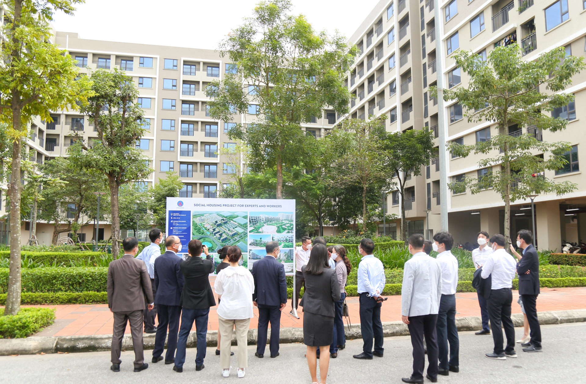 Trong khuôn khổ làm việc, Tổng giám đốc Ji Jong Rip và đoàn Amkor đã đến thăm Dự án nhà ở dành cho chuyên gia và công nhân nằm ngay trong KCN Yên Phong. Dự án có quy mô 20ha, với căn hộ liền kề, chung cư và các tiện ích như nhà hàng, siêu thị,.. sẽ đáp ứng chỗ ở cho gần 6000 chuyên gia và công nhân. Đặc biệt, một tổ hợp công trình đa chức năng – Khu thiết chế văn hóa nhà ở xã hội bao gồm: 01 trường Tiểu học (quy mô 15 lớp), 01 trường Mầm non (quy mô 12 lớp), nhà Văn hóa (phục vụ đồng thời khoảng 1.000 người), trạm Y tế và công viên cây xanh, khu tập Thể dục thể thao … được đầu tư xây dựng trên khu đất 17.000m2, là minh chứng rõ nét cho việc Viglacera không chỉ luôn tiên phong trong việc phát triển hạ tầng Khu công nghiệp mà còn trong việc đầu tư đồng bộ Khu đô thị gắn liền với KCN, với mục tiêu đáp ứng tốt nhất nhu cầu chỗ ở, làm việc, sinh hoạt, đi lại của người lao động, gián tiếp hỗ trợ chi phí và tạo nguồn nhân lực dồi dào cho các doanh nghiệp hoạt động trong KCN của Viglacera.