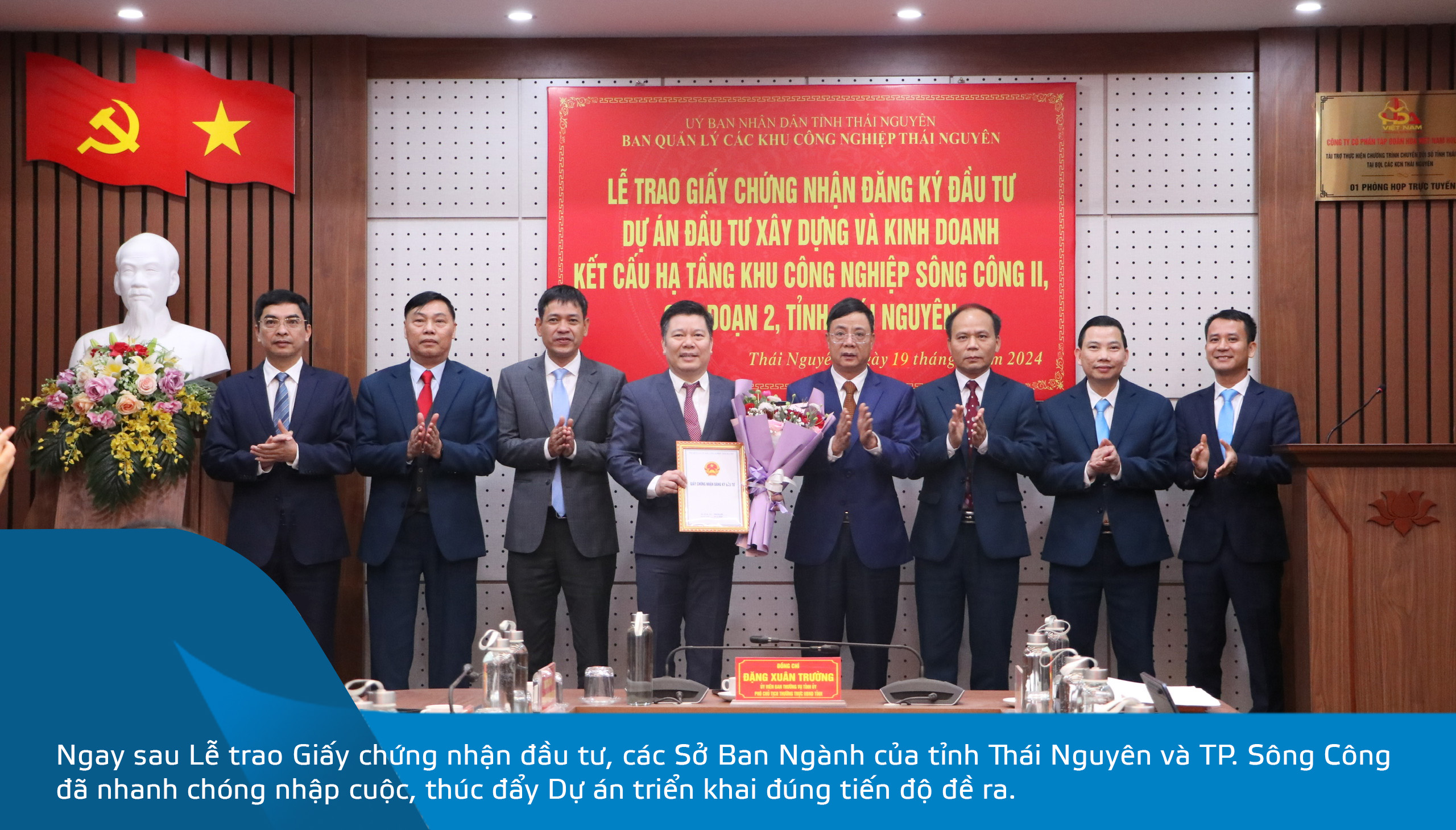 Ngày 19/3 , tại Thái Nguyên, UBND tỉnh Thái Nguyên, Ban Quản lý các Khu công nghiệp tỉnh Thái Nguyên đã tổ chức Lễ trao Giấy Chứng nhận đăng ký đầu tư Dự án đầu tư xây dựng và kinh doanh kết cấu hạ tầng Khu Công nghiệp Sông Công II, giai đoạn 2, tỉnh Thái Nguyên.