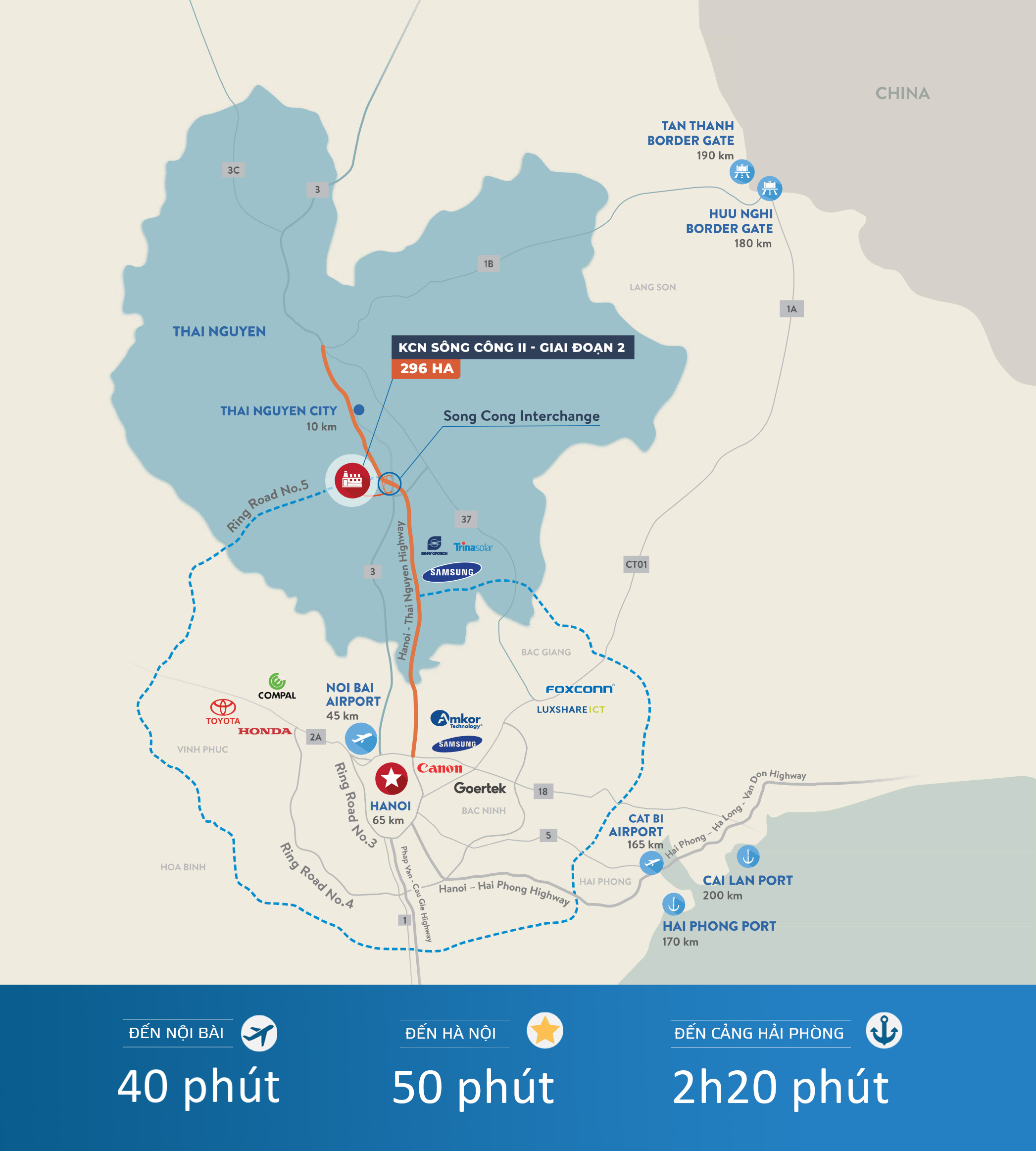 Vị trí đắc địa, nền địa chất tốt, giao thương thuận lợi : Không chỉ là vị trí có nền địa chất tốt, giúp giảm chi phí đầu tư xây dựng, KCN Sông Công II còn có nhiều lợi thế liên kết vùng như: cách Sân bay quốc tế Nội Bài 45km, thời gian di chuyển 60 phút; cách TP Thái Nguyên 8km, thời gian di chuyển là 18 phút; cách Cảng Hải Phòng 180km, thời gian di chuyển là 2h 20 phút. Chưa kể từ KCN cũng kết nối được nhanh chóng đến các trung tâm sản xuất điện tử, bán dẫn, ô tô tại Thái Nguyên, Bắc Ninh, Bắc Giang, Vĩnh Phúc.