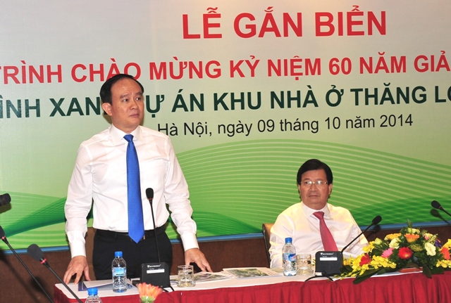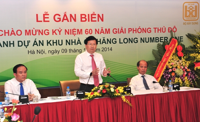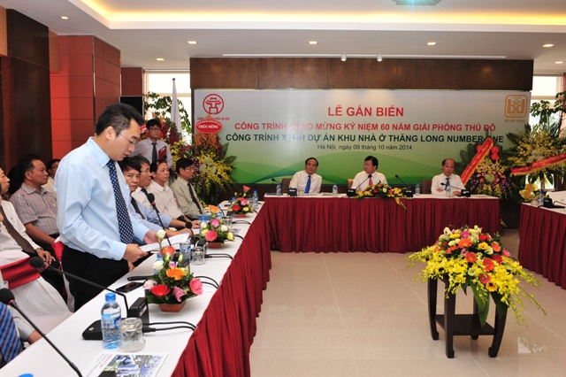 Bộ trưởng Bộ Xây dựng Trịnh Đình Dũng, Thứ trưởng Bộ Xây dựng Nguyễn Trần Nam, Phó Chủ tịch UBND Tp. Hà Nội cùng Tổng giám đốc Nguyễn Anh Tuấn gắn biến “Công trình xanh”, Công trình chào mừng kỷ niệm 60 năm giải phóng Thủ đô cho dự án Khu nhà ở Thăng Long Number One