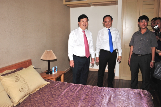 Bộ trưởng Bộ Xây dựng Trịnh Đình Dũng và Phó Chủ tịch UBND TP. Hà Nội Nguyễn Ngọc Tuấn thăm căn hộ trong khu nhà ở Thăng Long Number One