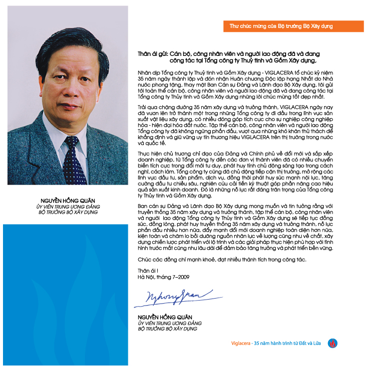 Thư bộ trưởng Bộ Xây dựng nhân dịp 35 năm Viglacera