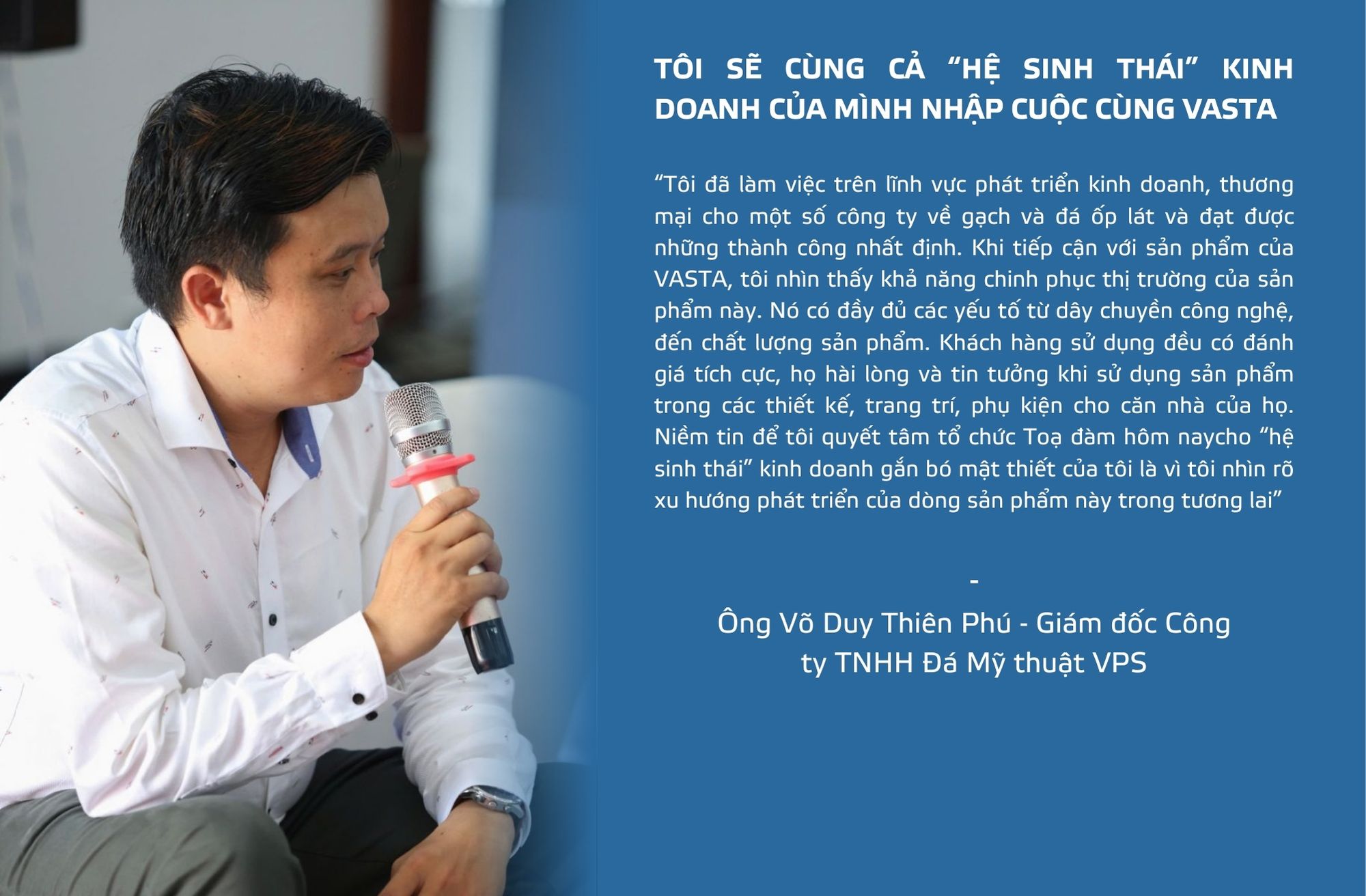 Vasta Stone và Công ty TNHH Đá Mỹ thuật VPS vừa phối hợp tổ chức tọa đàm “Tầm quan trọng vật liệu trong thiết kế thi công nội ngoại thất” với sự tham gia của các chuyên gia, CEO, kiến trúc sư, chủ đầu tư và các nhà phân phối trên lĩnh vực này.