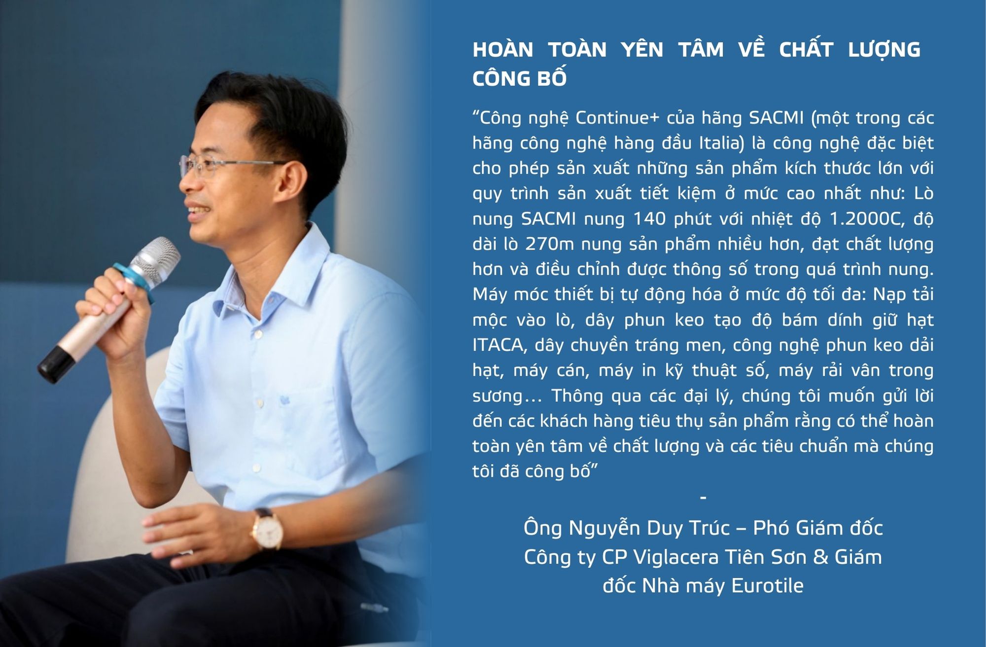 Trước khi Tọa đàm diễn ra, các đại biểu tham quan nhà máy Viglacera Eurotile tại KCN Mỹ Xuân A, tỉnh Bà Rịa - Vũng Tàu để tìm hiểu dây chuyền sản xuất đá nung kết vân trong xương - sản phẩm dù mới xuất hiện trên thị trường khoảng 1 năm đã thu hút sự quan tâm lớn từ nhiều khách hàng và đối tác.