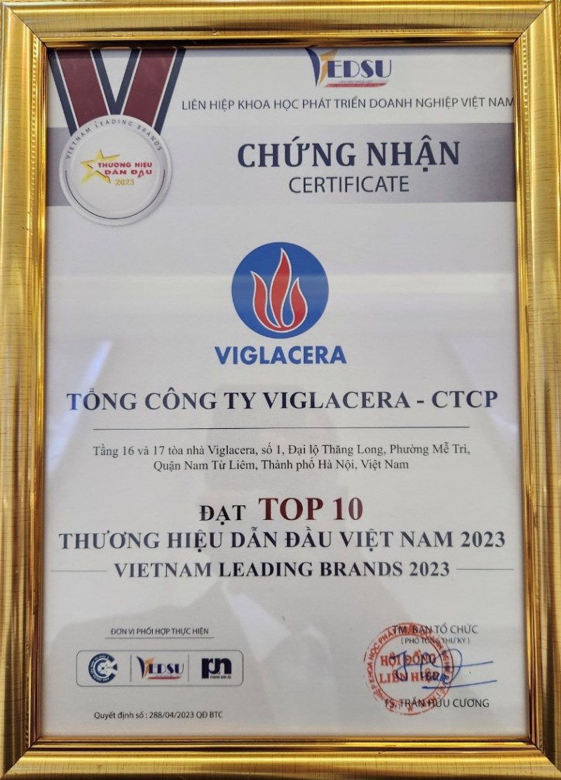 Tổng công ty Viglacera – CTCP nhận giải thưởng “Top 10 thương hiệu dẫn đầu Việt Nam 2023”