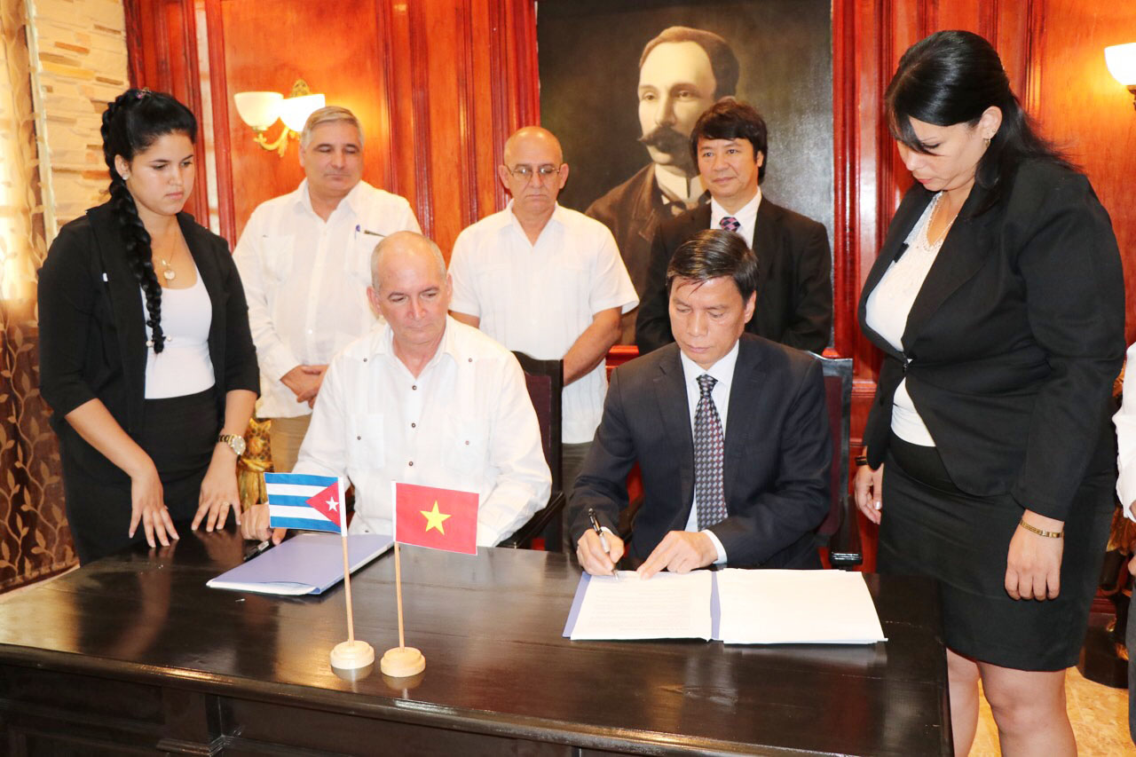 Chủ tịch Công ty Prodimat Cuba và Đại diện TCT Viglacera – CTCP ông Ngô Trung Dũng – Viện trưởng Viện Nghiên cứu Viglacera ký hợp đồng ra mắt liên doanh sản xuất VLXD Sanvig trước sự chứng kiến của các Lãnh đạo nước Cộng hòa Cuba và Chủ tịch HĐQT TCT Viglacera Luyện Công Minh