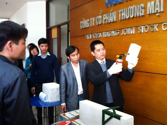 Ông Nguyễn Đức Hưng - Phó GĐ Cty Bê tông khí Viglacera thử nghiệm giới thiệu những tính năng ưu việt