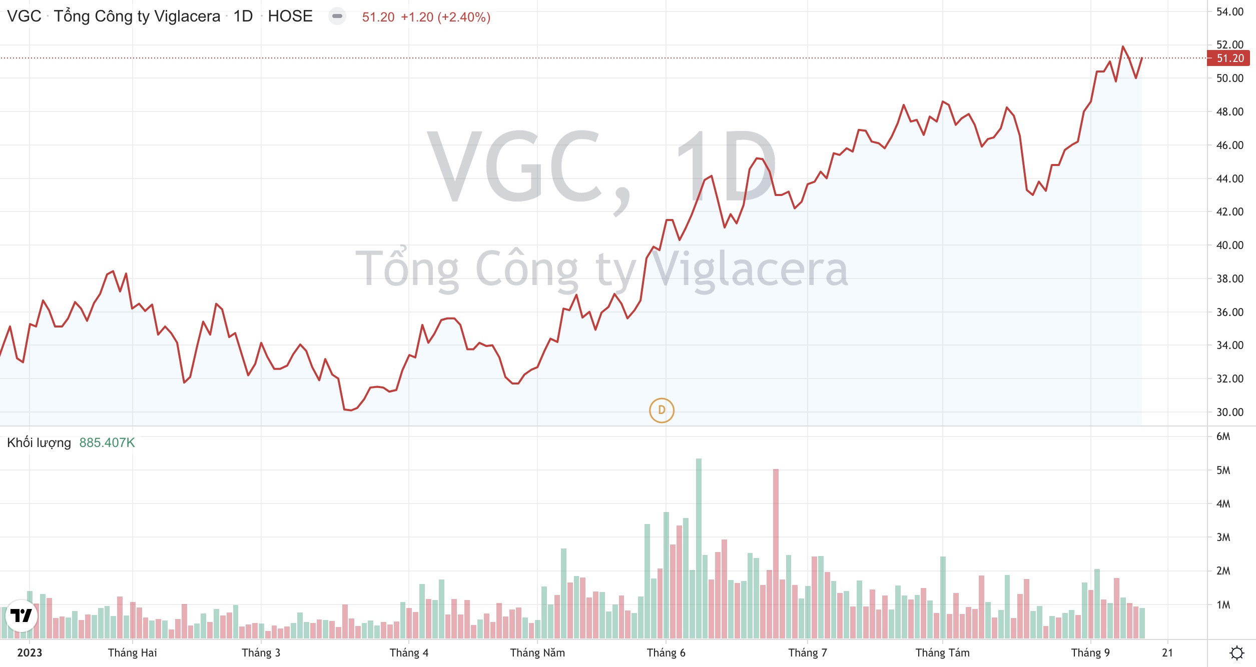 Khối lượng giao dịch và xu hướng giá cổ phiếu VGC của Tổng Công ty Viglacera từ đầu năm 2023 đến nay. (Nguồn: TradingView)